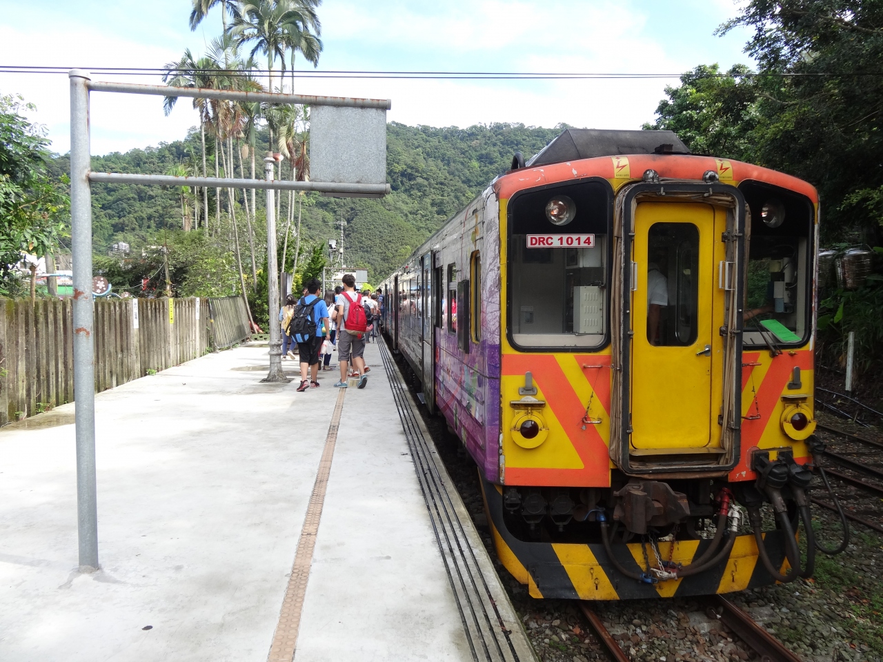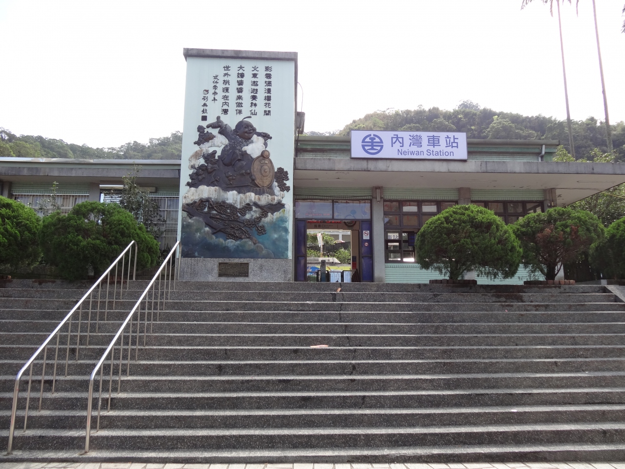 内湾線の終着駅です。駅舎は昔ながらの雰囲気を残しており味があります。駅前から内湾老街が広がっており、歴史的な建物もあり、休日は観光客で賑わいます。近くの河原ではバーベキューなど楽しむ家族連れの姿が目につきます。