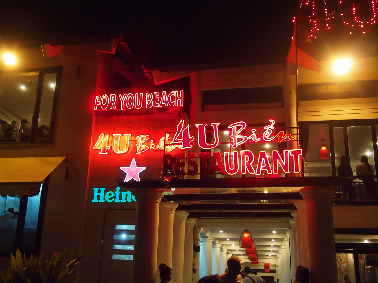 ビーチ沿いの料理店が集まった場所にある海鮮料理店。店内通路に魚や貝が入ったトレーが並び、指して注文する。夕食で行ったが、15名程度の団体だったのでガイドが予め頼んであり、海老のボイル、ずわい蟹のようなカニの足、蒸し魚等の普通の料理が出てきた。店は割りと大きく、客もある程度いたが、何か特色があるわけでなく、普通の海鮮料理だった。