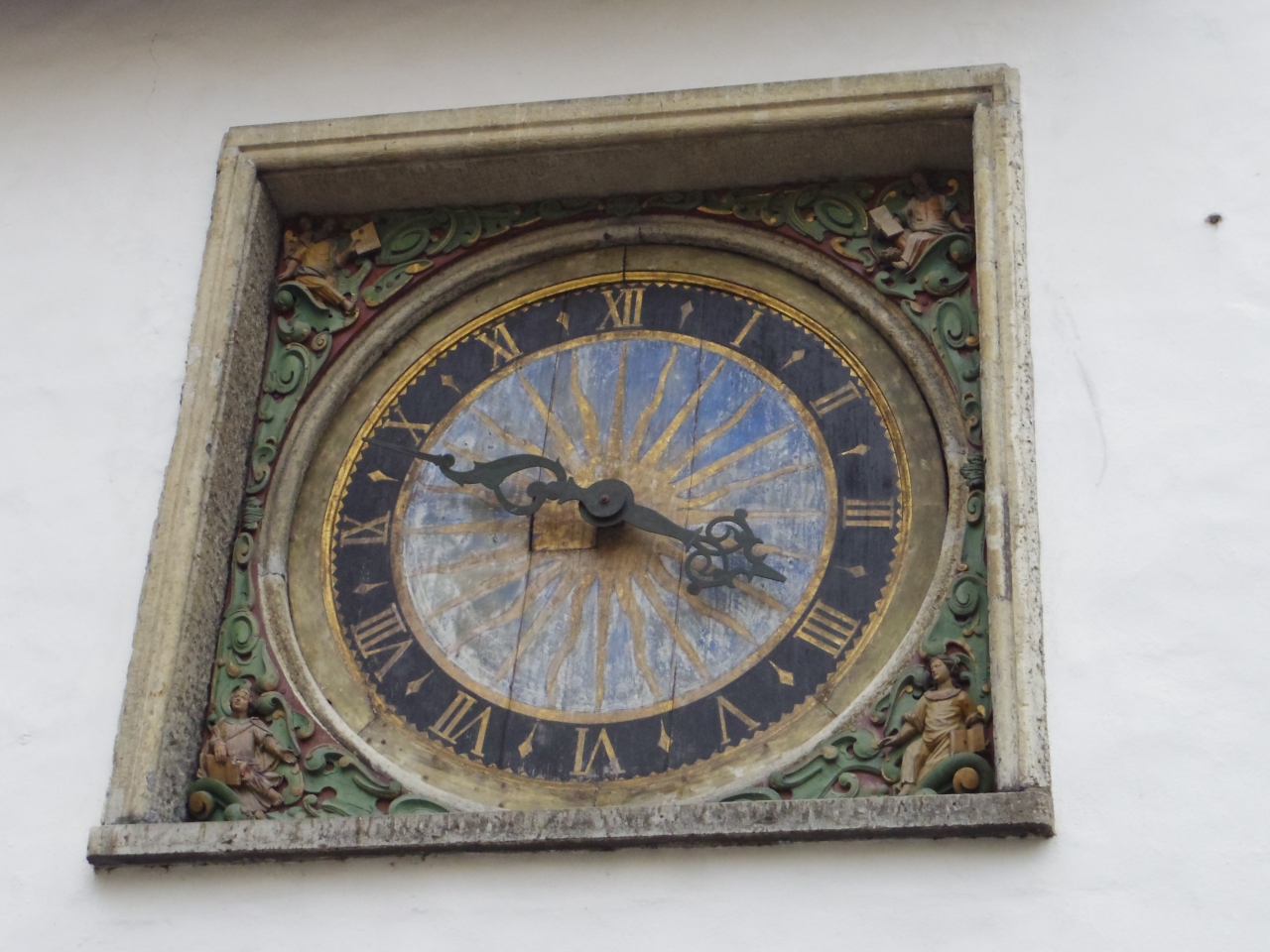 正面の精巧に彩られた大きな時計はタリンで最も古い公共の時計です。