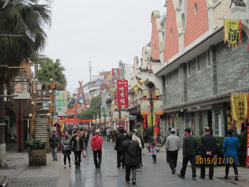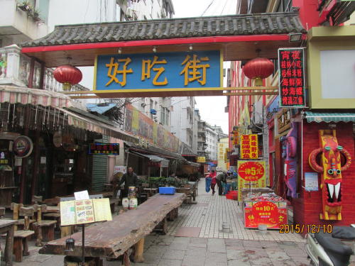 桂林正陽歩行街(歩行者天国)は桂林都市部の南にある正陽門から真南に杉湖北路までの全長666m続く歩行街です。700年ほど前の明時代から始まる歴史ある路です。地元住民対象の商店街ですが観光客にも人気があります。桂林の特産品の店も多くあり三花酒、桂花酒、豆腐乳、唐辛子味噌、ゆば、飴の酥、寸金、落花生糖、胡麻糖などはお土産にもなります。木犀の香りがする桂花酒を飲んで見ましたがアルコール度が52度と高く苦手です。正陽歩行街には恋人同士の若者も多く集まります。夜は外国人が多く集まり、酒やビール、ワインと飲んで食べて、それは賑やからしい。昼間の観光で疲れて夜、正陽歩行街まで来る元気は有りませんでした。