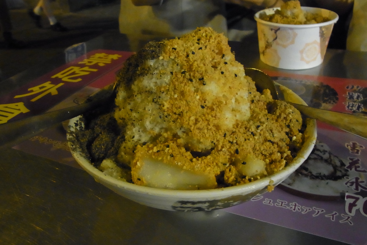 オプショナルツアーで十分に行った帰りにガイドさんがお勧めの氷があると連れて行ってくれました。練乳のかかったかき氷にゴマとピーナッツをすったものがたっぷりかかっておりその横に熱々のお餅!お餅の周りの氷が熱で溶けそれがまた美味しい。日本では食べた事の無い味でした。また食べたい~♪