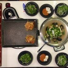 いろいろな貝が入っていて、唐辛子で味付けしたチゲは少し辛め。なんかおつまみに似合いそうな・・