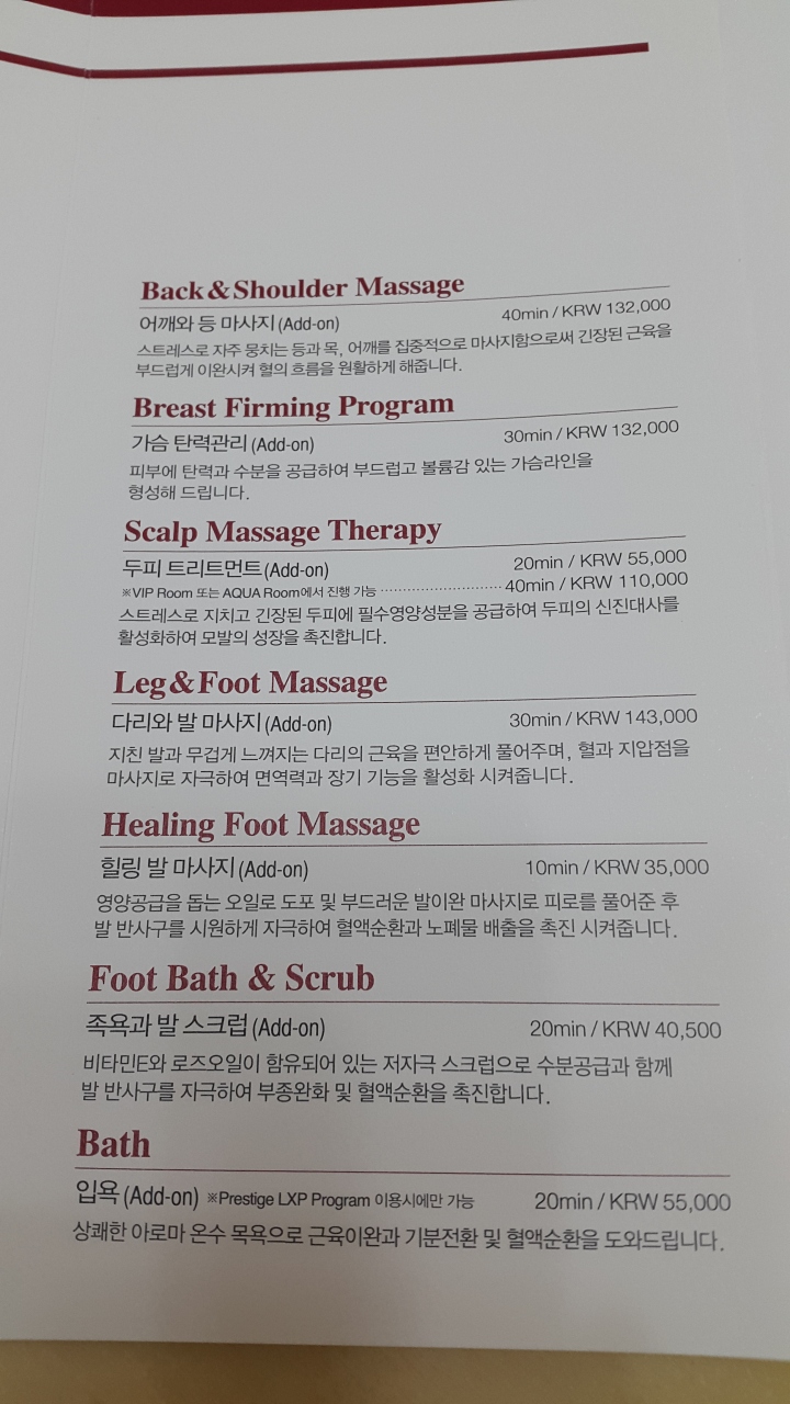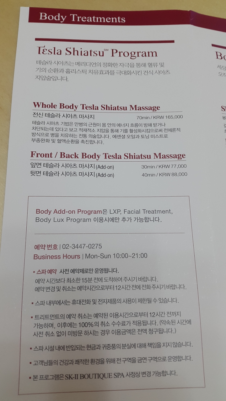 今回私が受けたのは、「テスラ指圧プログラム」の「Whole Body Tesla Shiatsu Massage](70分 165,000w)です。