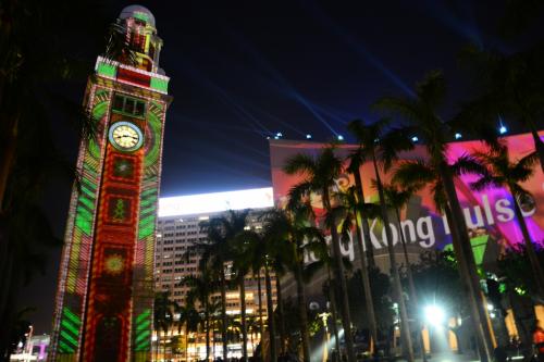 旧九龍駅時計台と香港文化センターでは、クリスマスの期間中(12月28日まで)、Hong Kong Pulse 3D Light Showというプロジェクションマッピングが行われています。時間は20:20、20:45、21:15、21:45~。10分ほどのショーです。ちょうど20時からのシンフォニー・オブ・ライツを見た後に、後ろを振り返ると、プロジェクションマッピングをやっていたので見学しました。クリスマスをテーマにしたショーで、今の時期にぴったり。シンフォニー・オブ・ライツを見た後は、プロジェクション・マッピング、おススメです。