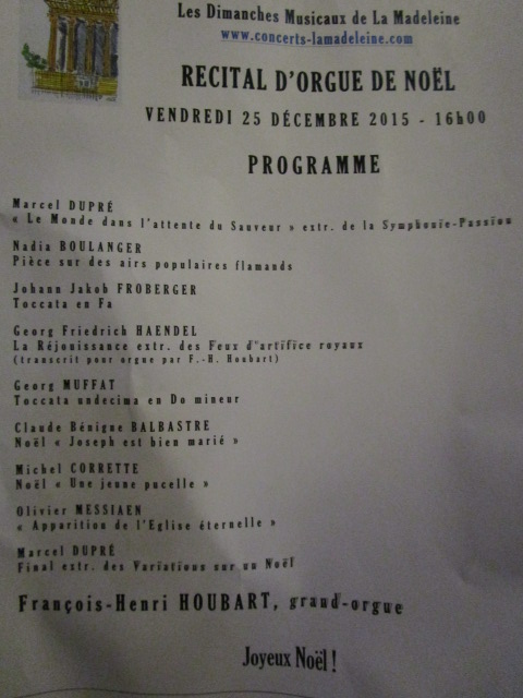 毎年恒例で、12月25日16時より、パイプオルガンコンサートが、無料にて、マドレーヌ寺院内で行われる。