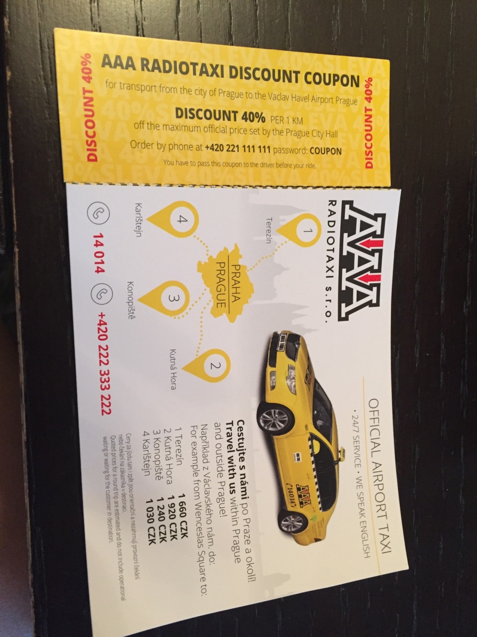 何となくAAAのカウンターへ。受付の人に「市内までいくらくらい?」と聞くと、“だいたい700コルナ”と言われてお願いすることに。