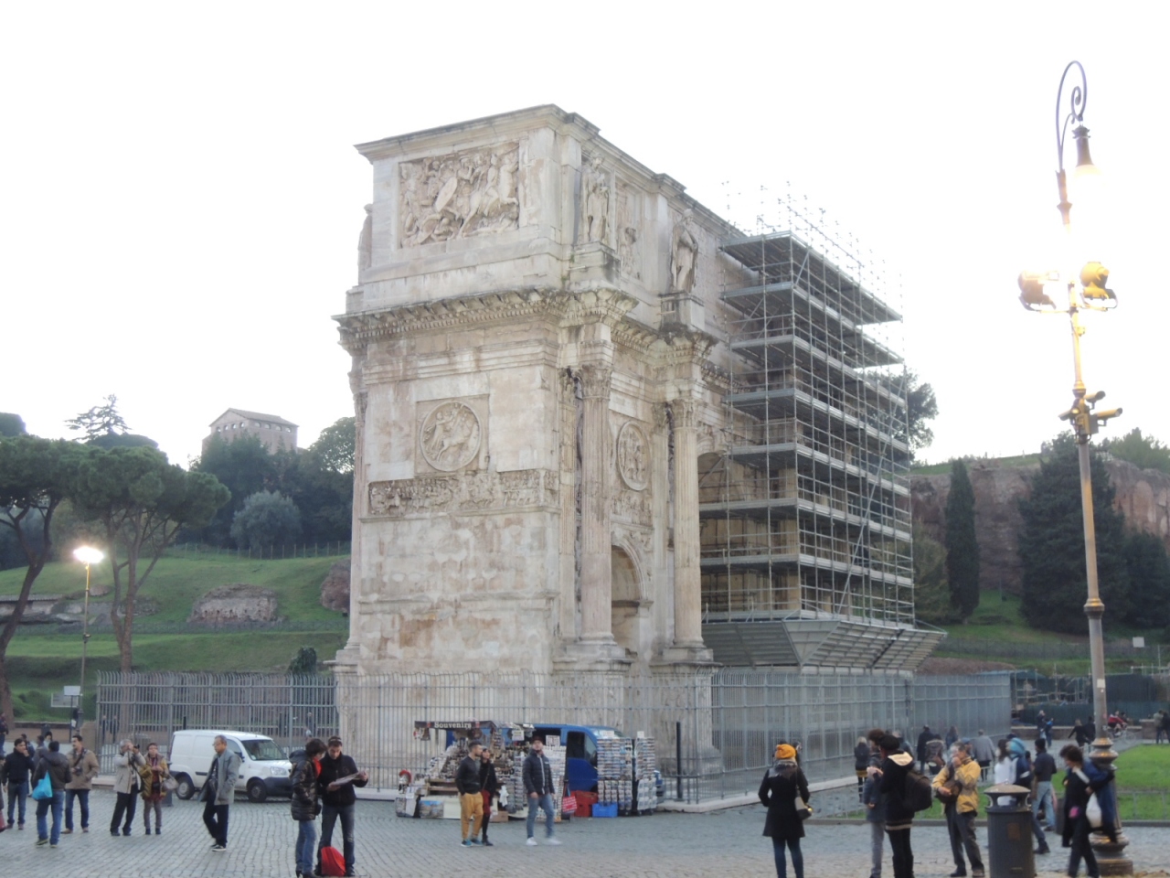 フォロ・ロマーノとコロッセオの間に位置している「コンスタンティヌスの凱旋門」は、高さ28mでローマで最も大きく保存状態も良い建造物です。 西側半分を修復中でしたが 、近くで見上げるととても大きく感じ、レリーフ細工も細かく施されていて見応えがありました。存在感のある堂々たる凱旋門だと思いました。