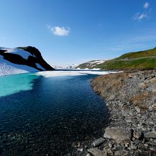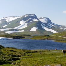 もしレンタカーだったり行動の自由があったら,ソグネフィヨルド近くのとっておきの穴場を紹介!一つがVikafjelletの高原.VossからE16号線でGudvangenへと向かい,途中Vinjeで国道13号線をVangsnes方向へ,途中滝の横を登るつづら折りの道も圧巻.さらに高原に出ると8月下旬でも氷と湖が続く絶景.息をのむ美しさだ.ソグネフィヨルドに来る観光客は多いのになぜすぐとなりのこの高原に来ないのか信じられない.途中サーメ人のお土産屋もある
