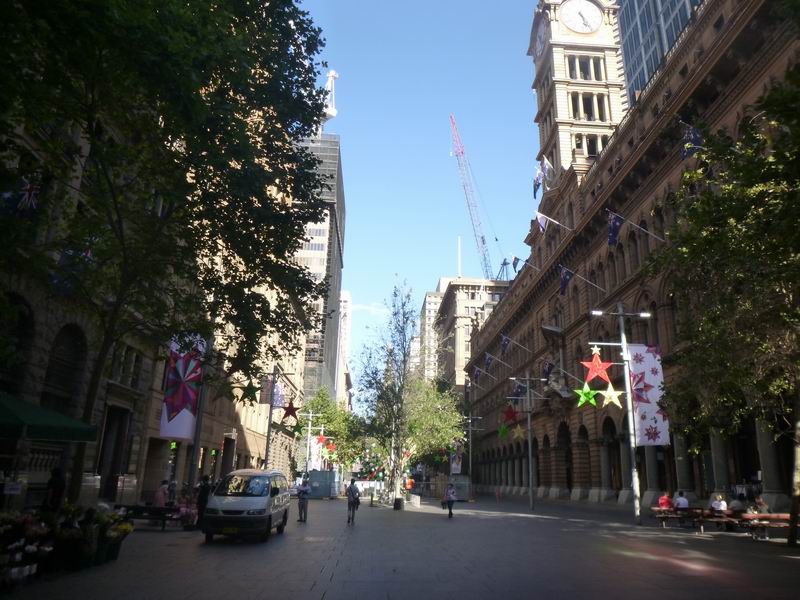 ジョージ通りからマックオリー通りまで東西に500mほどの歩行者用の通りです。車は通らないですが道幅はゆったりしてます。繁華街というよりはオフィス、銀行などが多いビジネス街といった感じ。ワールドスクエアやタウンホール周辺の賑やかさはなく、むしろ落ち着いた雰囲気でした。時計台のある旧中央郵便局の建物が目を惹きました。