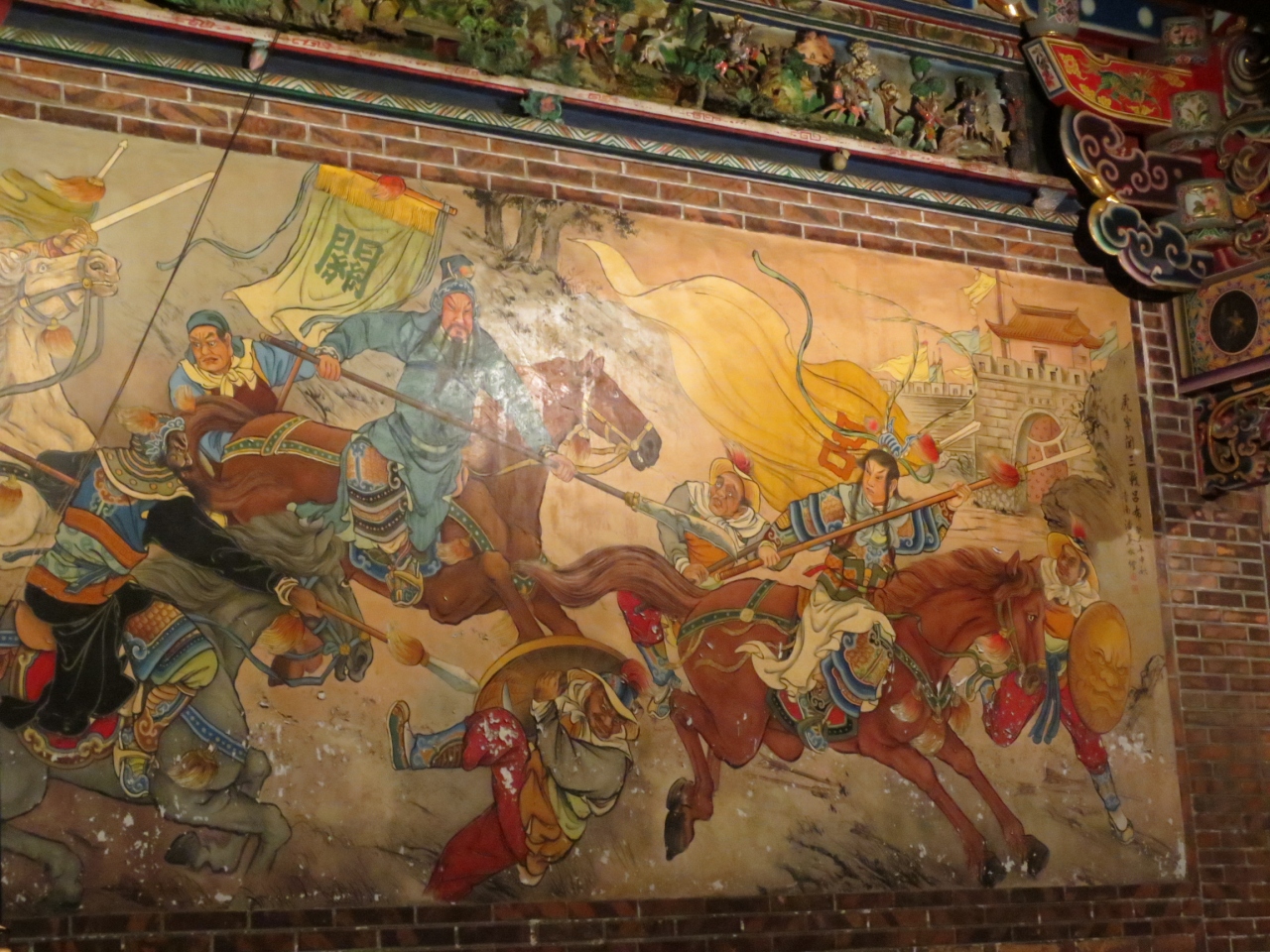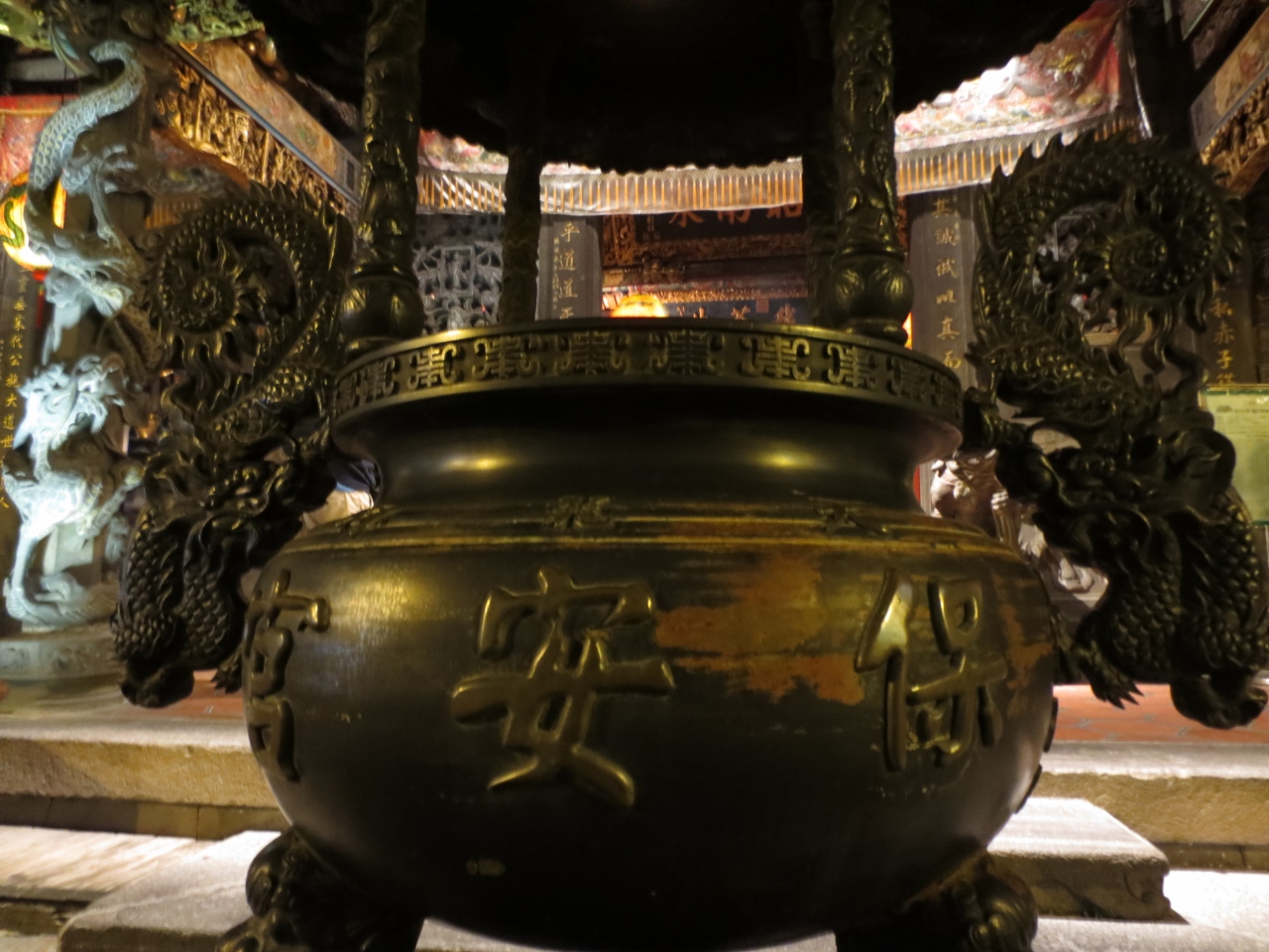 入口にある香炉のけむりをいただいて治療祈願しました。中に入るとたくさんの祭壇があります。中央の建物の周辺には絵画が描かれています。すべてカラフルで、照明を浴びて本当にきれいに見えました。奥のビルにはたくさんの提灯がともっており、こちらもきれいでした。