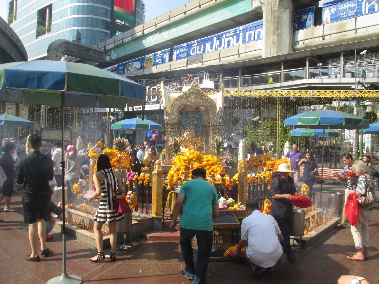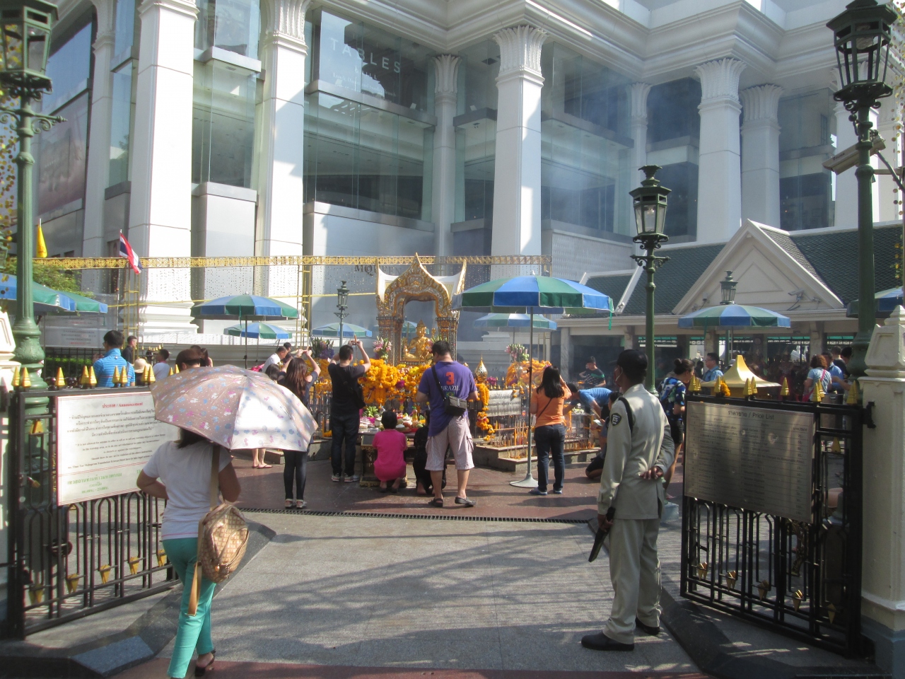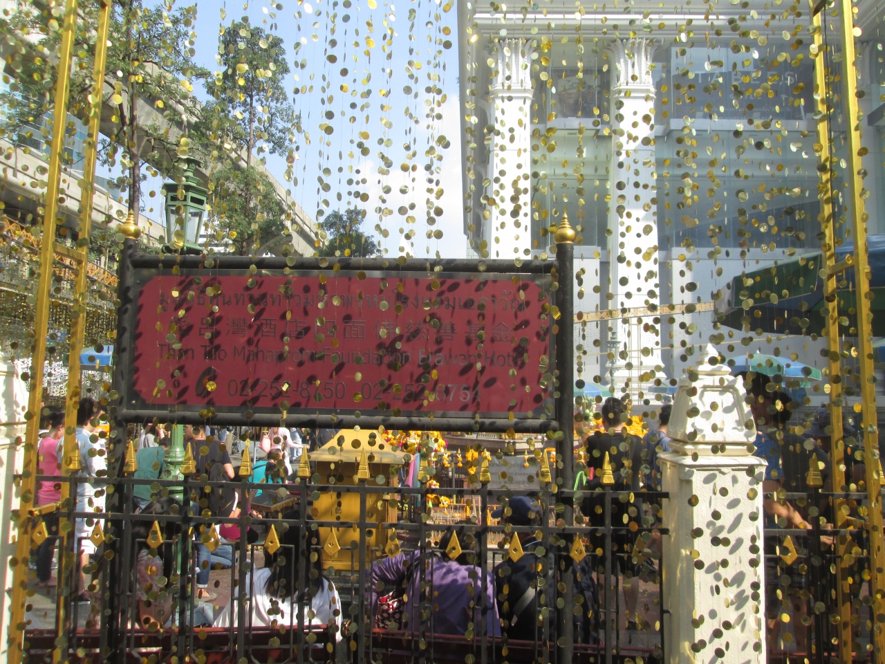 年末・年始とクリスマスシーズンのため、エラワン・プームの飾りが特殊仕様になっていました。周囲の柵に金色のデコレーションが施され、さらに、きれいになっていました。平日の日中から熱心な参拝者がたくさん訪問していました。