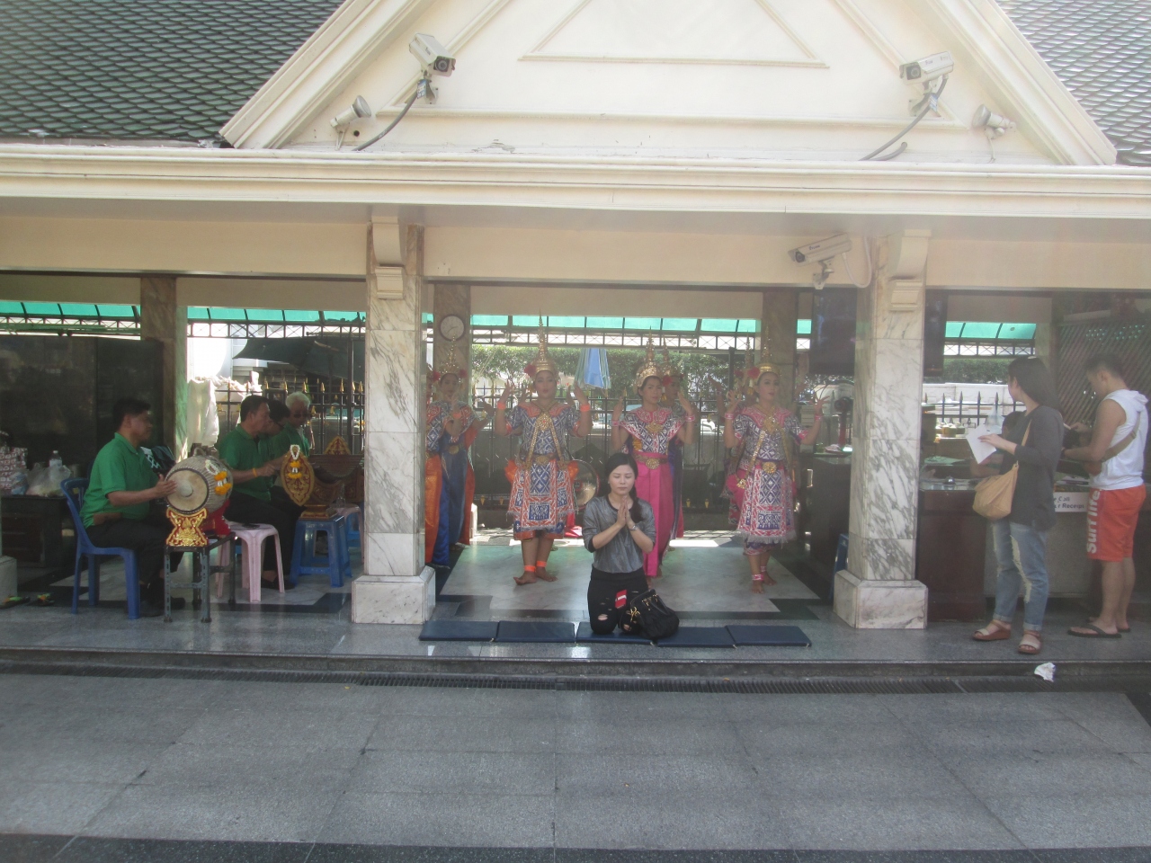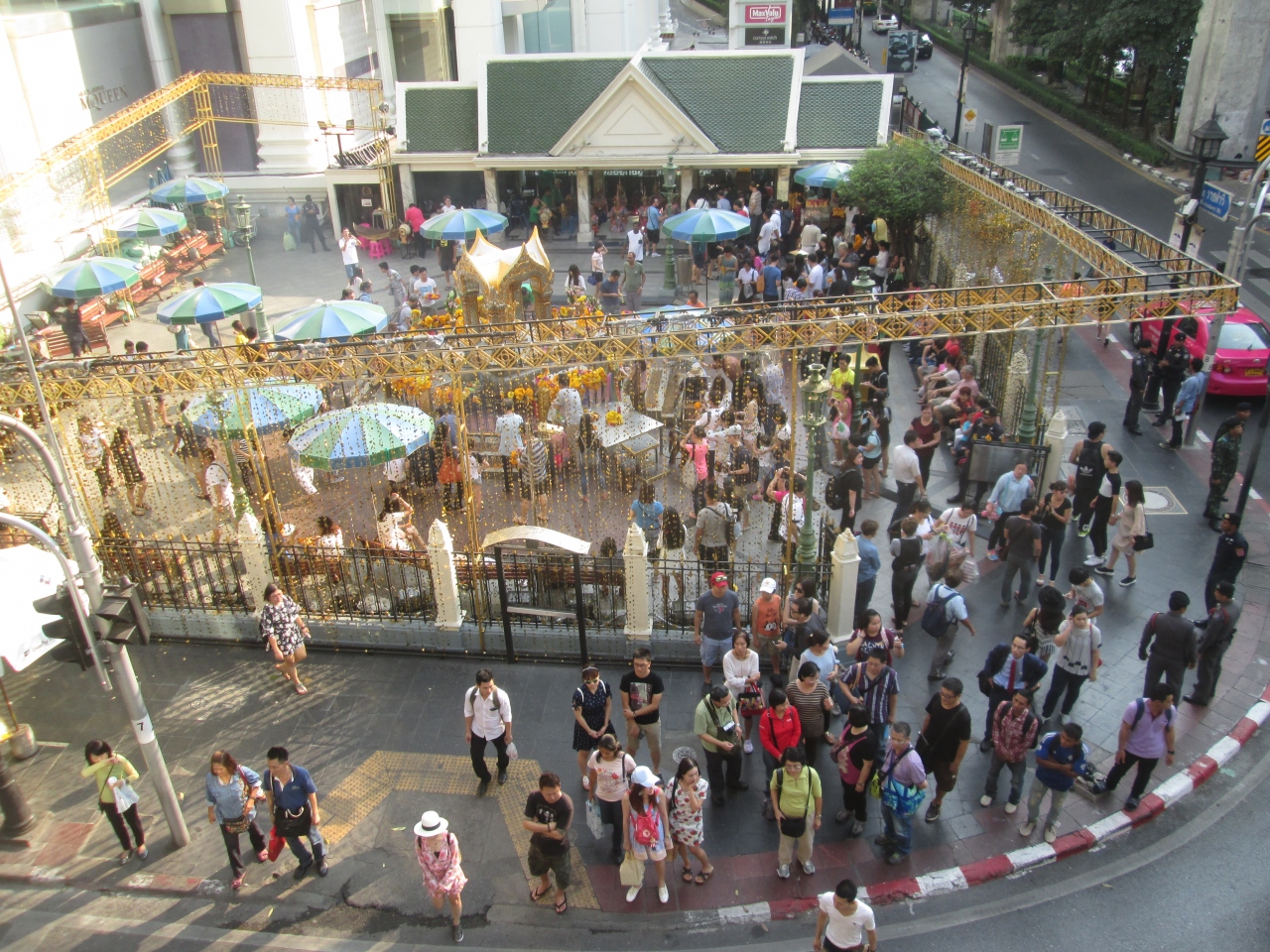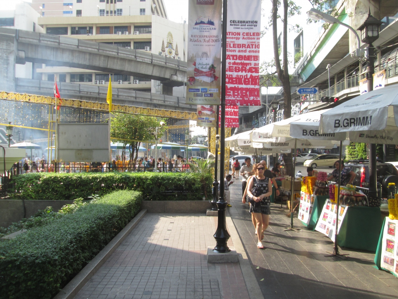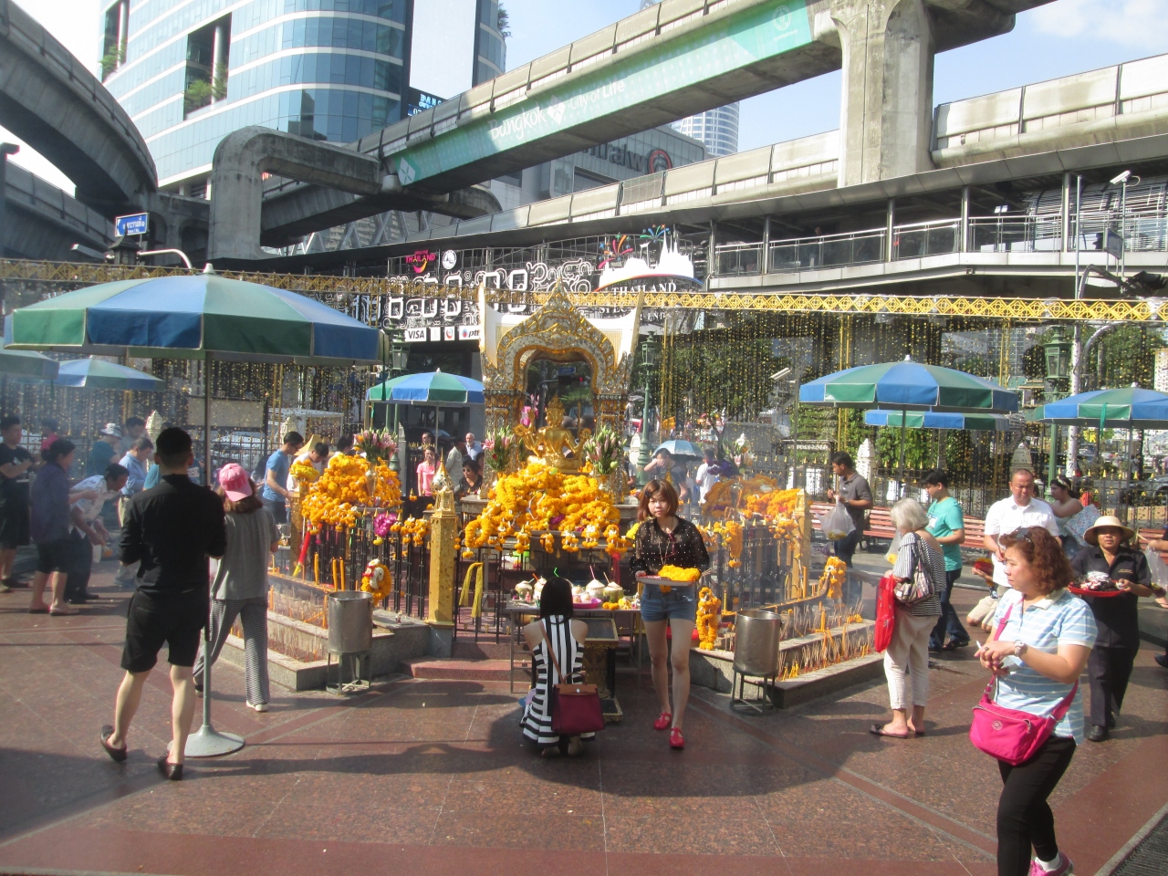 年末・年始とクリスマスシーズンのため、エラワン・プームの飾りが特殊仕様になっていました。周囲の柵に金色のデコレーションが施され、さらに、きれいになっていました。平日の日中から熱心な参拝者がたくさん訪問していました。