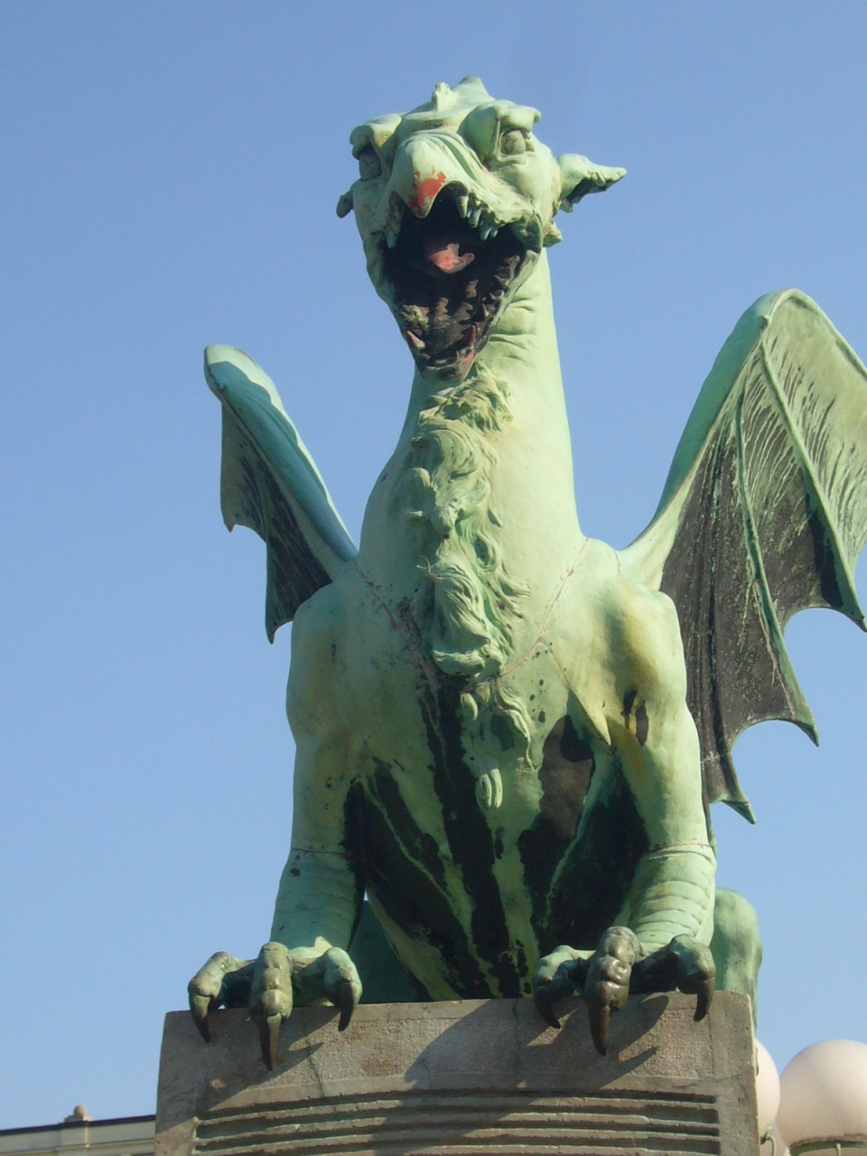 リュブリャナ観光の中心地であるプレシェルノヴ広場から3分程のところにある、もうひとつの有名な橋です。橋自体も綺麗な橋ですが、橋の四隅に龍の銅像が建てられています。(龍のリアリティというのも変ですが)けっこうリアリティがある像で撮影ポイントです。