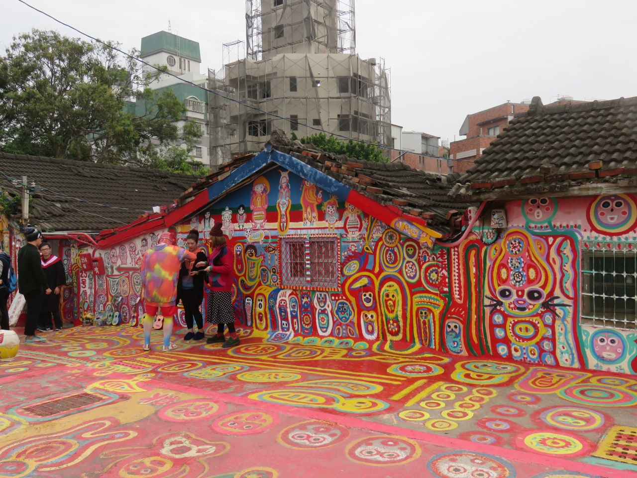 - 都会風な街の中にポツンと古い家屋があり壁画が鮮やかに目立っています。