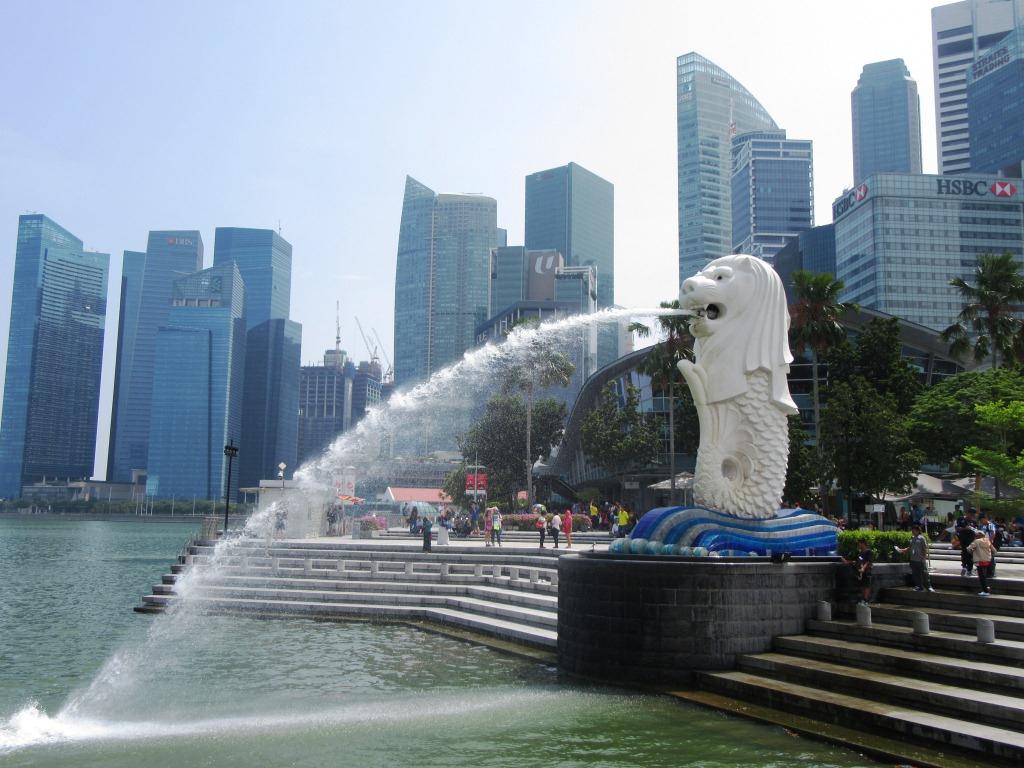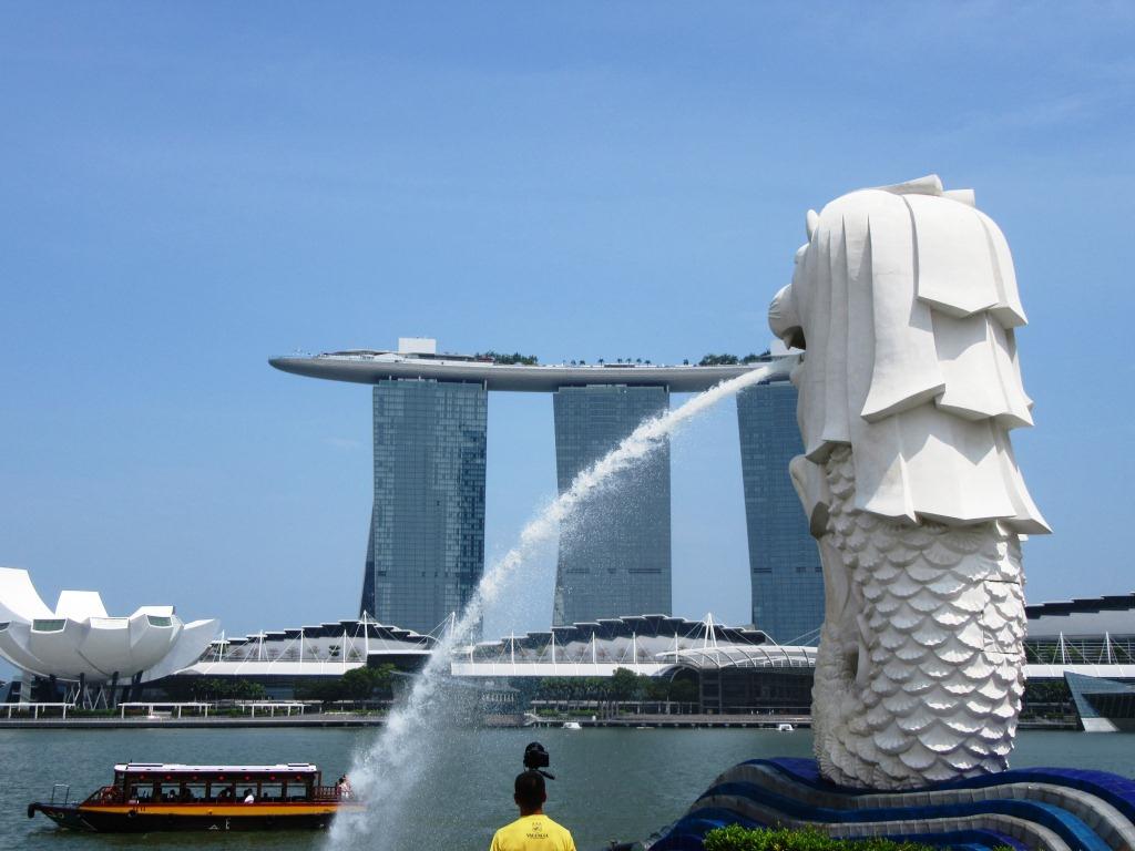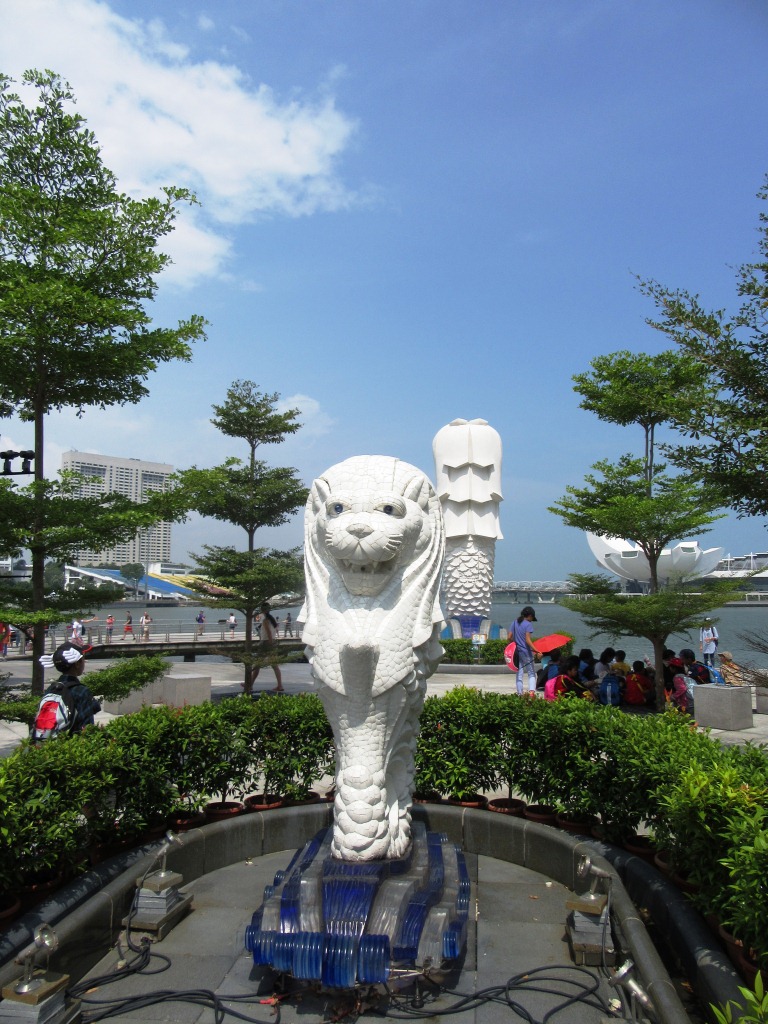 マーライオンはシンガポール観光の目玉として作られたものです。かつての場所から海側に移転し、今では周辺に土産物センターやスタバカフェもあります。口から勢いよく水を吐き出すその姿は堂々としていました。マリーナベイサンズと一緒にファインダーにおさめると絵になります。