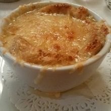 あつあつのオニオングラタンスープ、もうおいしくておいしくて病みつきになる美味しさでした。