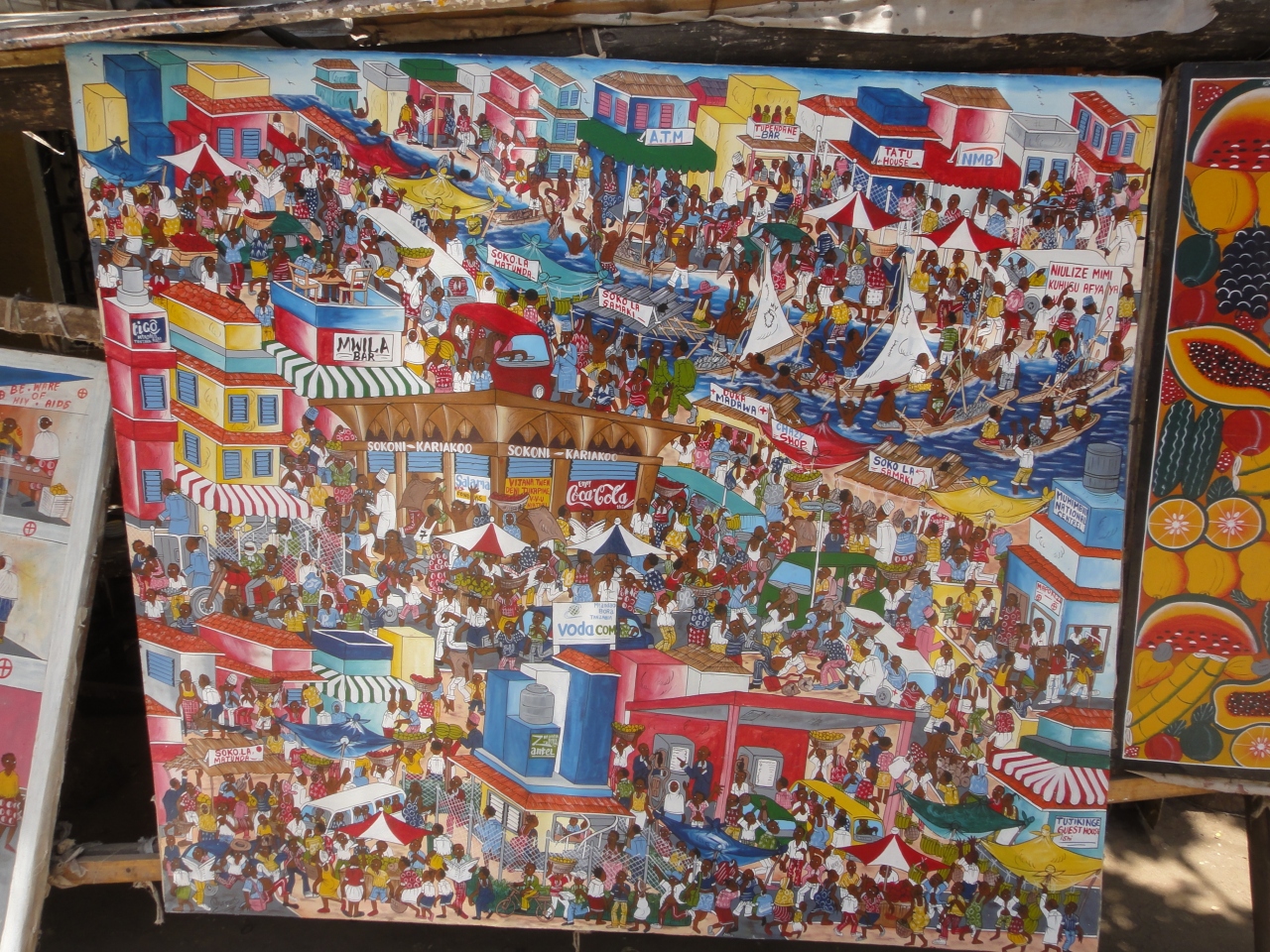 ティンガティンガという絵のジャンルだそうです。ペンキのような絵の具を使った色鮮やかな絵画です。写実的というよりは簡略化したようなものでイラスト的な要素が大きいかなといった印象です。大勢の絵描きさんが施設内で絵を描いており、その手元を見ているだけでも楽しかったです。