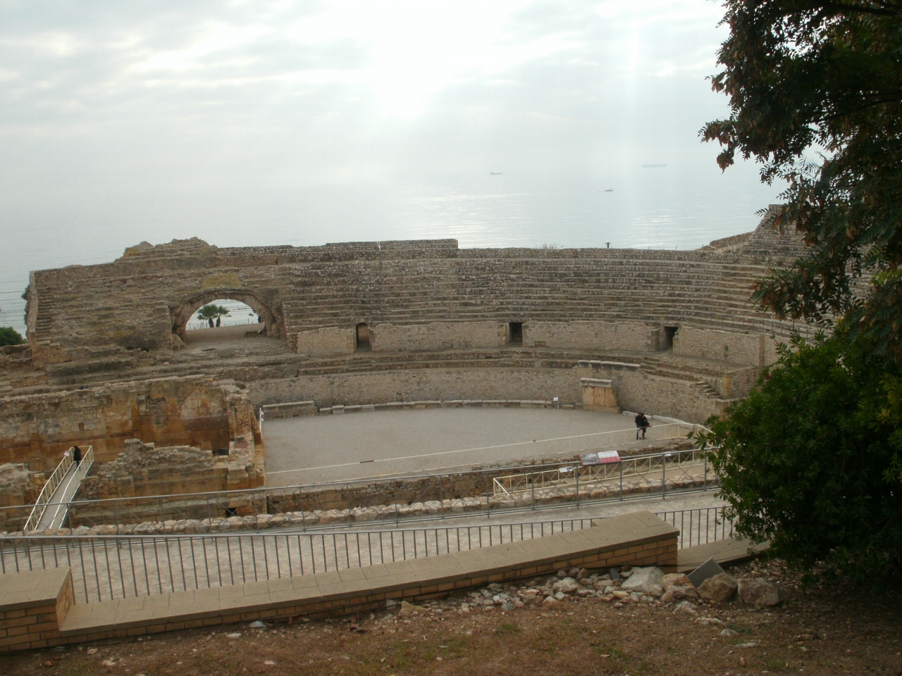 地中海に面するタラゴナ。市街地を抜けて地中海に達したところにある遺跡がここです。地中海と青い空とローマの遺跡は絵になる風景ですが、残念ながら曇っていました。それでも太陽光線が雲の間から出ている景色に感動。タラコトレインというバスを使うと便利です。