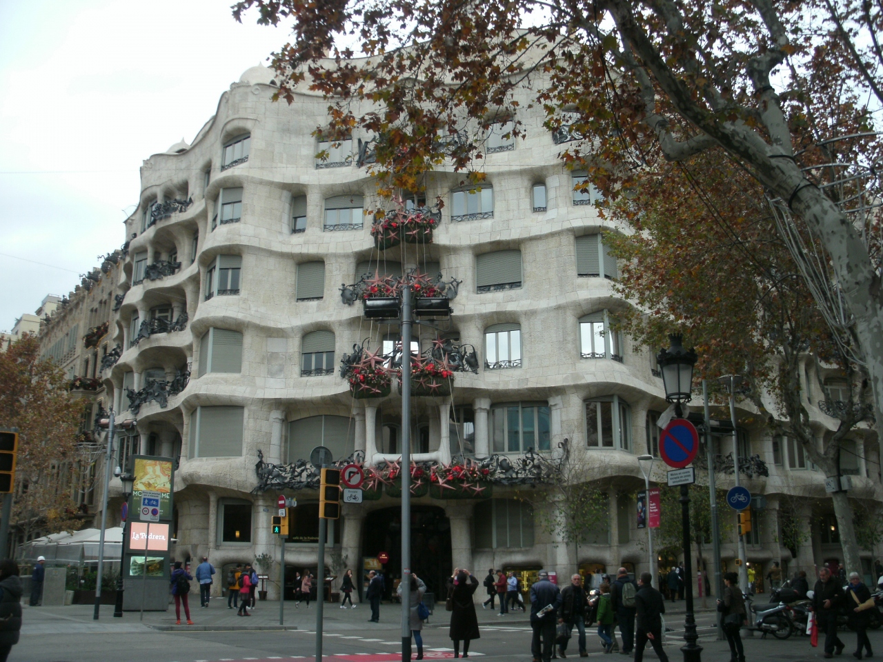 ガウディ建築を見るためにバルセロナ市内を歩きました。カサミラは有名なので、グラシア通りを歩いているとひときわ人が集まっている一角です。クリスマスの飾り付けが美しかった。内部を見学するにはけっこう入場料が高いとは思いますが。