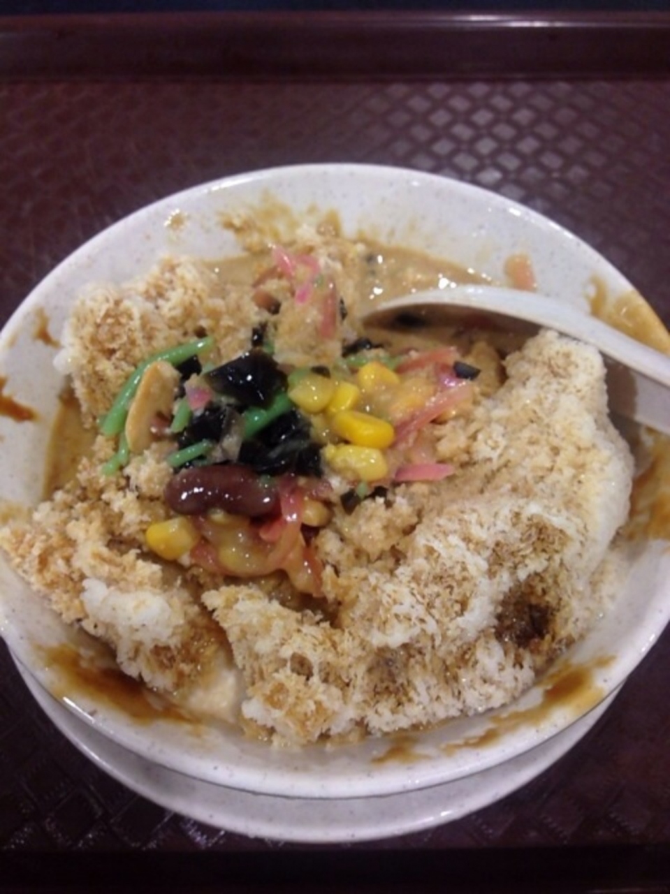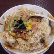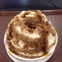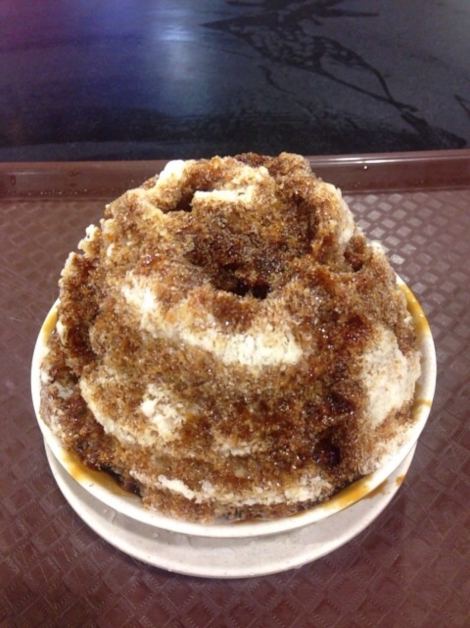先にブースでオーダーして、メモを貰ったら中央のレジでお金を払ってブースに戻ります。ここのカチャン、見た目はただの白いかき氷で、写真と全然違うなーと思っていたら、中に色々潜っていました!黒蜜とミルクの様な甘いソースとナッツの塩味とカリカリ感が新鮮で美味しかった。