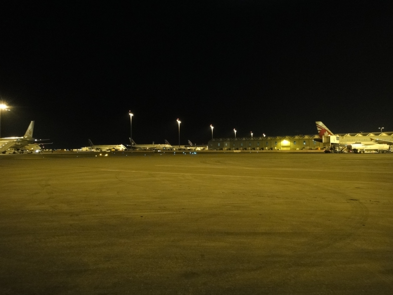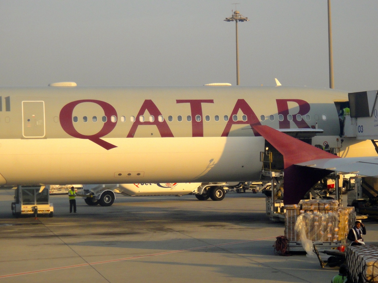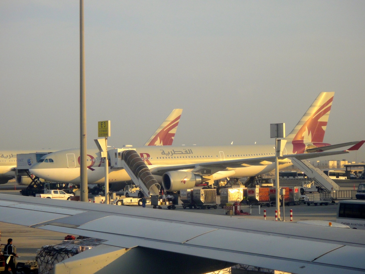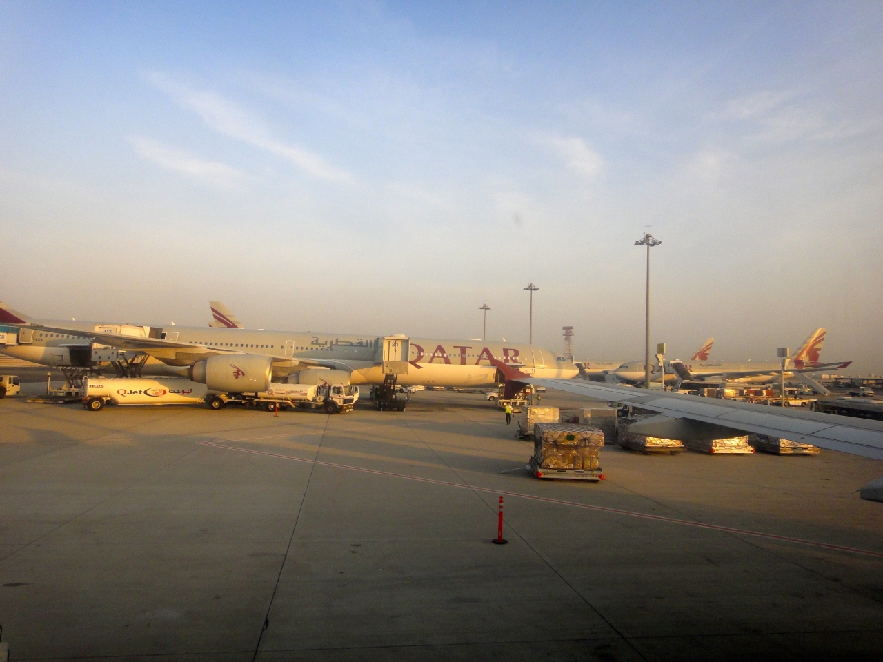飛ぶ鳥を落とす勢いの中東御三家エアラインのひとつカタール航空のハブ空港です。あたりまえですが空港スポットにカタール航空の機材がズラリと並ぶ様は壮観の一言です。砂漠地帯だけに空港敷地内も心なしか砂っぽい空気に覆われていて、霞んだ空にグレーの機体が溶け込む様に見えます。
