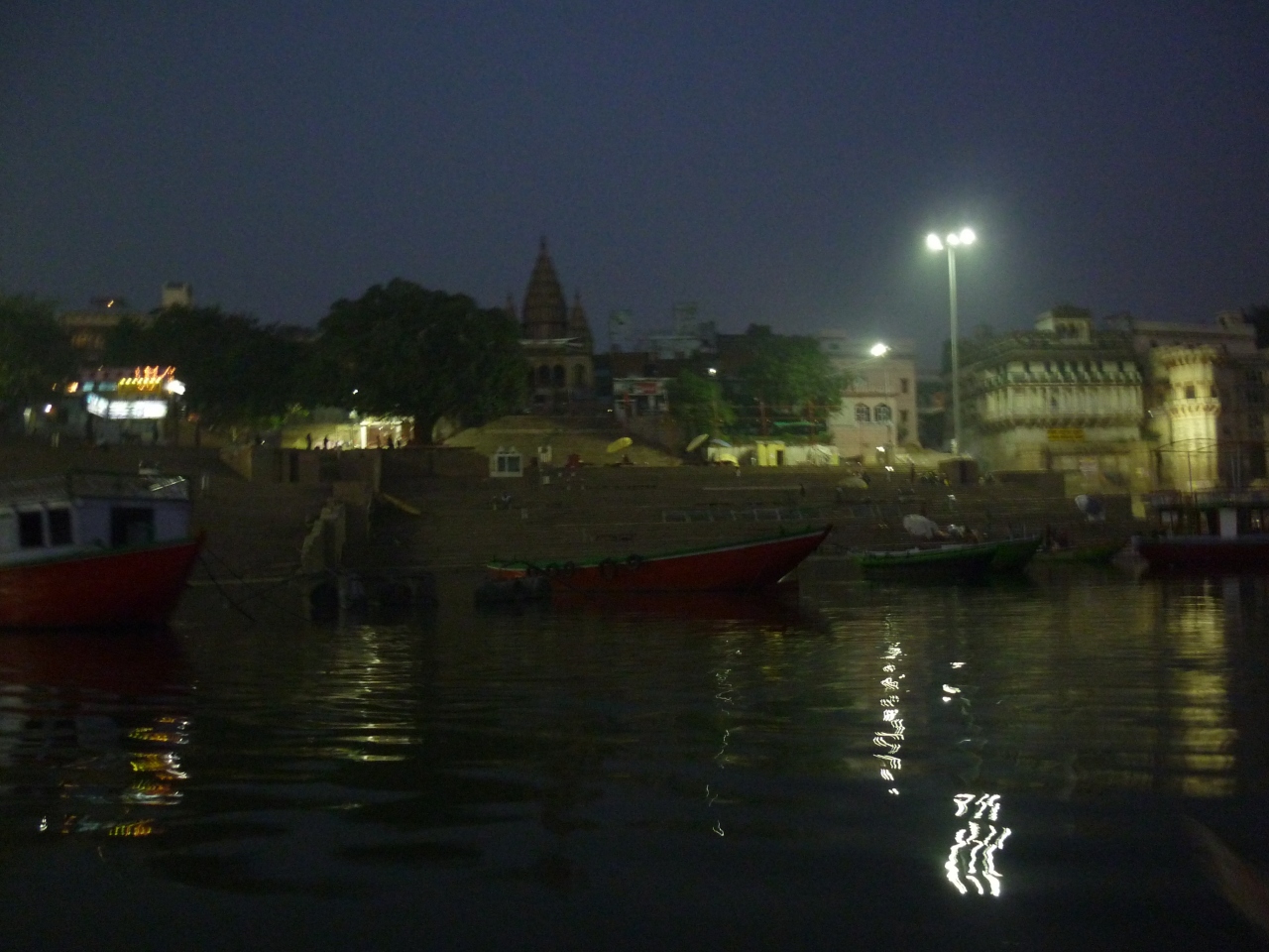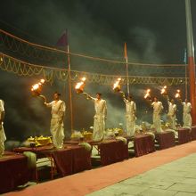 横に大きな広場があるので、そこでプージャーを催しています。ここで夜明け前のプージャーを見学してから、ボートに乗って火葬場のガートを見学に行きました。