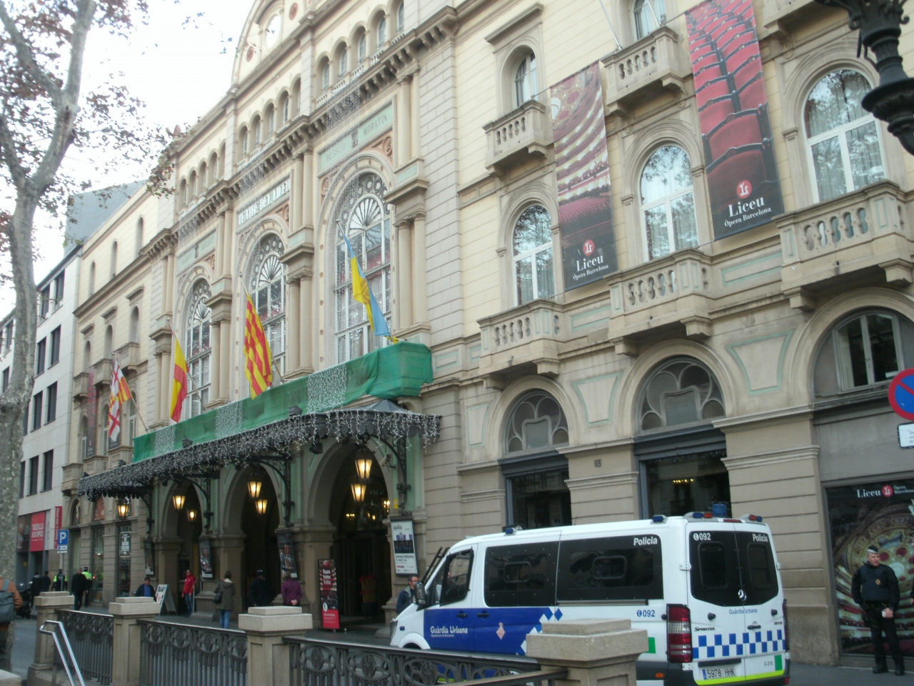 カタルーニャ広場から海に向かってランブラス通りを歩きました。メトロのリセウ駅を過ぎて、右側に見えるのがリセウ劇場です。格式のある建物がランブラス通りの華やかな雰囲気を相まって、素敵な景色です。この劇場の裏手はラバル地区で、治安があまりよくないので立ち入らないようにと言われました。