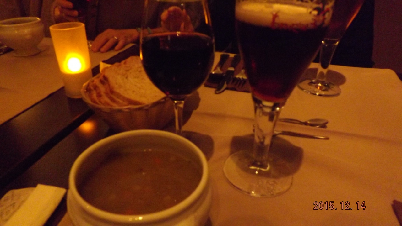 フランダースの郷土料理のひとつだそうで「カルボナード」と言い、日本のカレーみたいなものだそうです。土地柄から、ビールを使った料理は多いのですが、これは牛肉のビール煮込みだそうです。生野菜、フライドポテト付きの一皿でした。