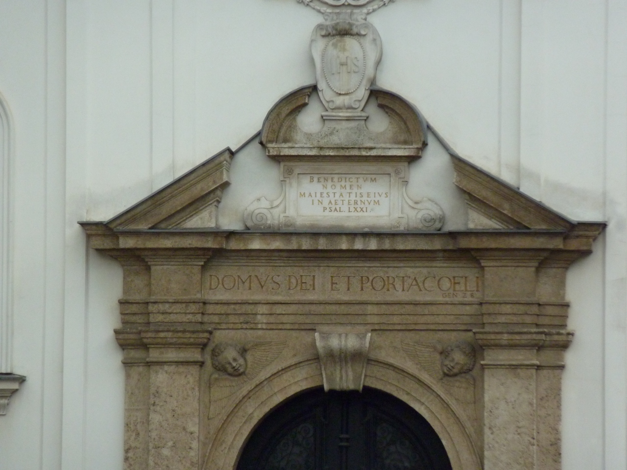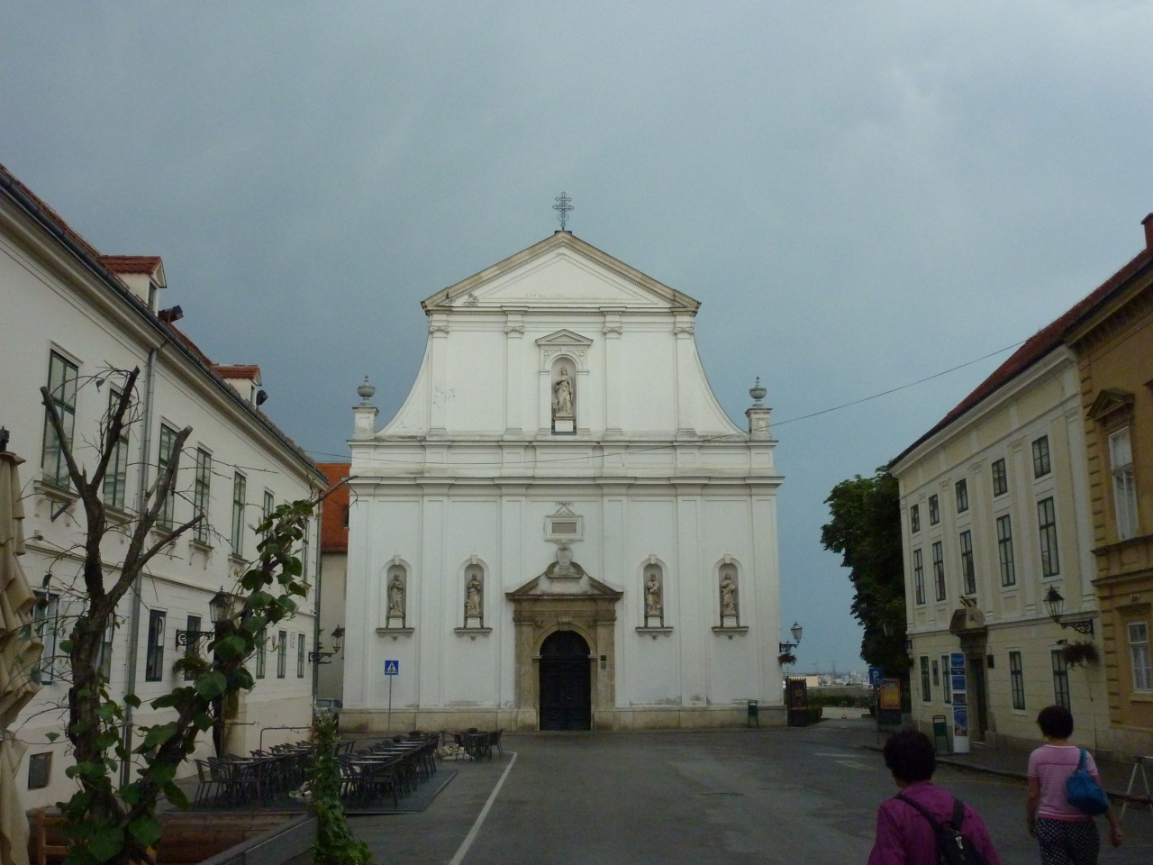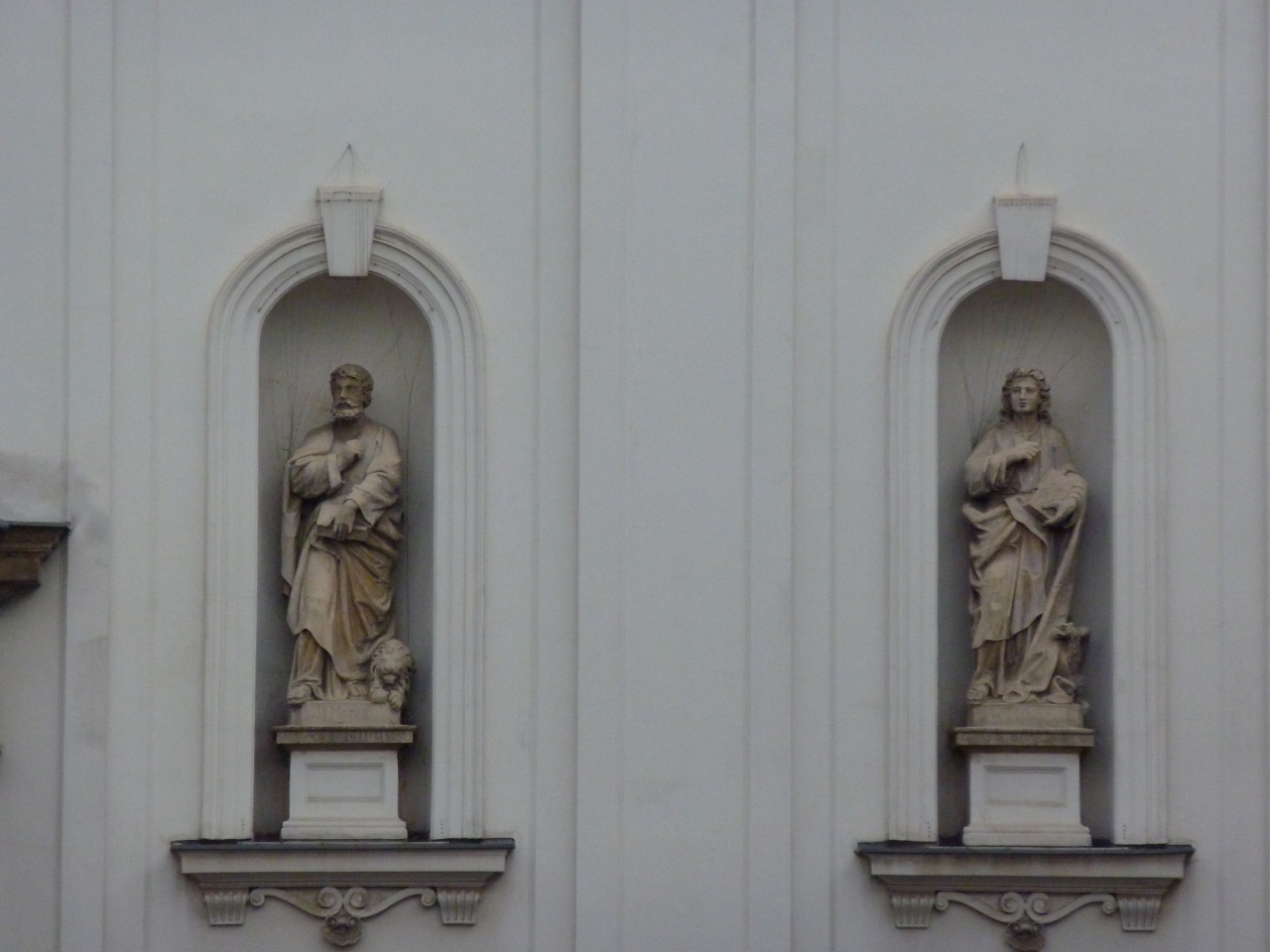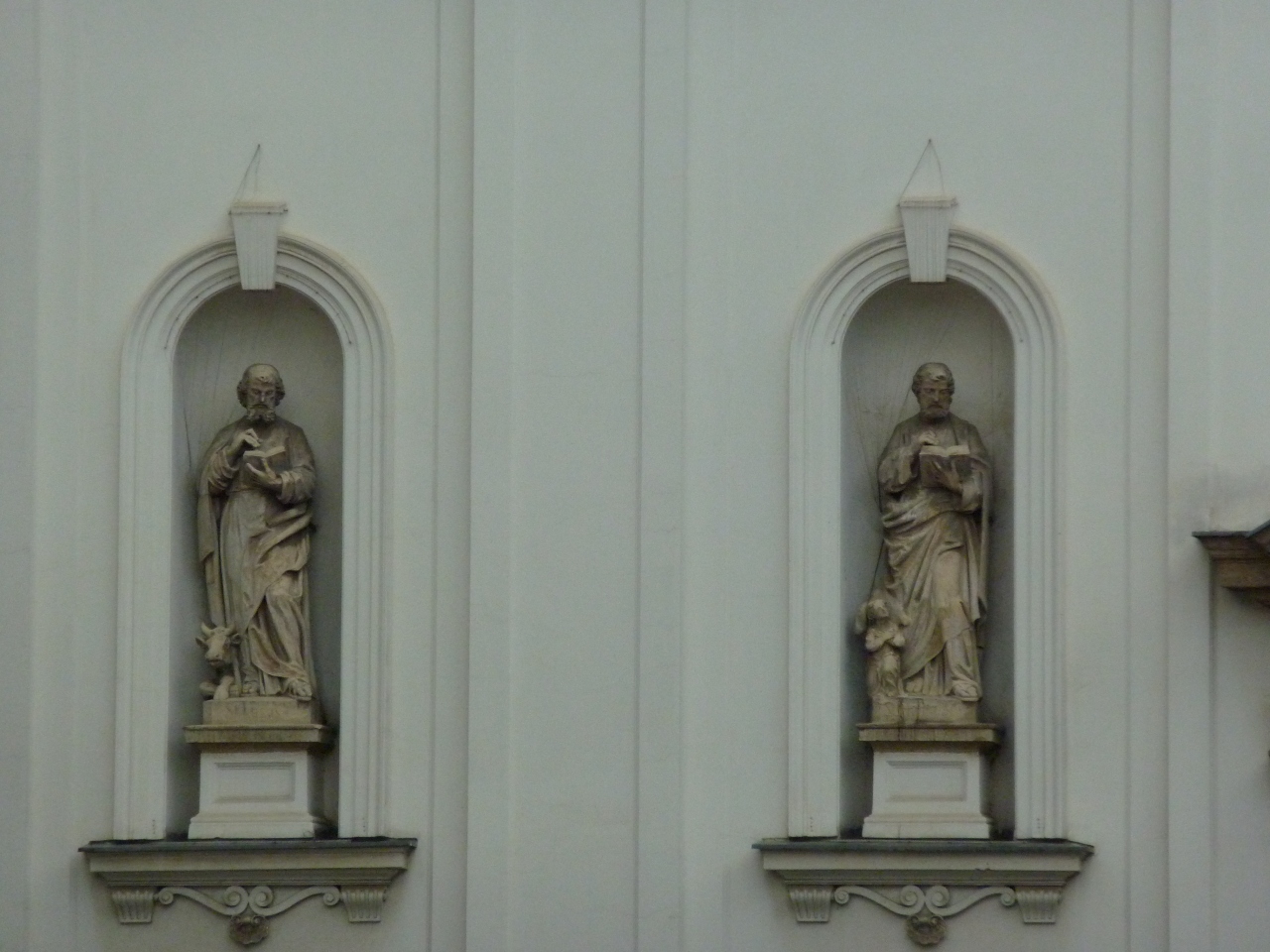聖マルコ教会から旧市庁舎の前の坂道を下って左手に広場があり、その奥に白壁の教会の姿が現れます。正面中央上部に女神像があり、その下に4人の書物を持った賢人の像が入り口を挟むように並んでいます。