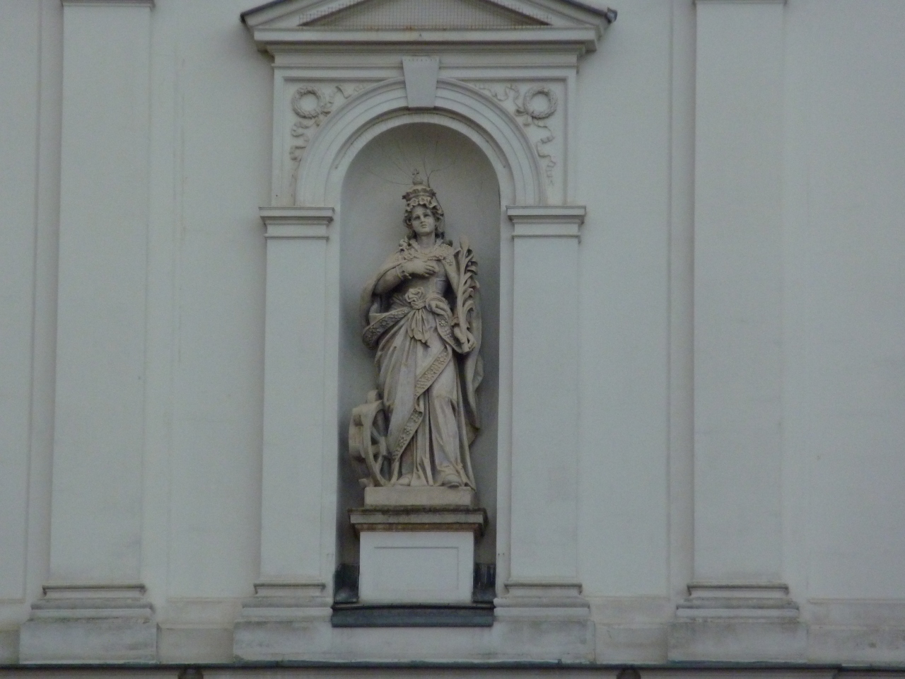 白壁の教会で正面には女神像と書物を持つ賢人の像があります