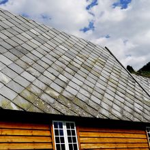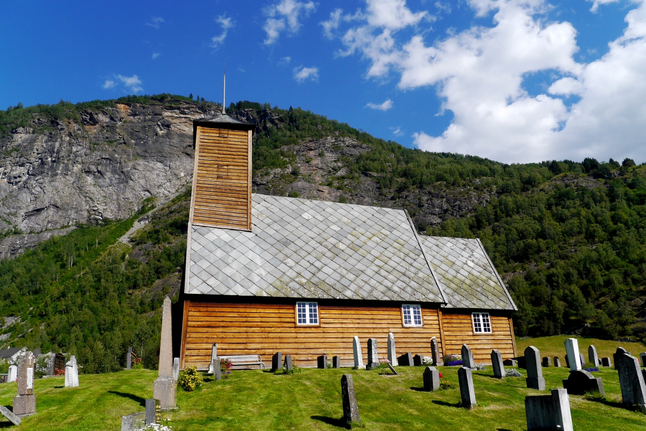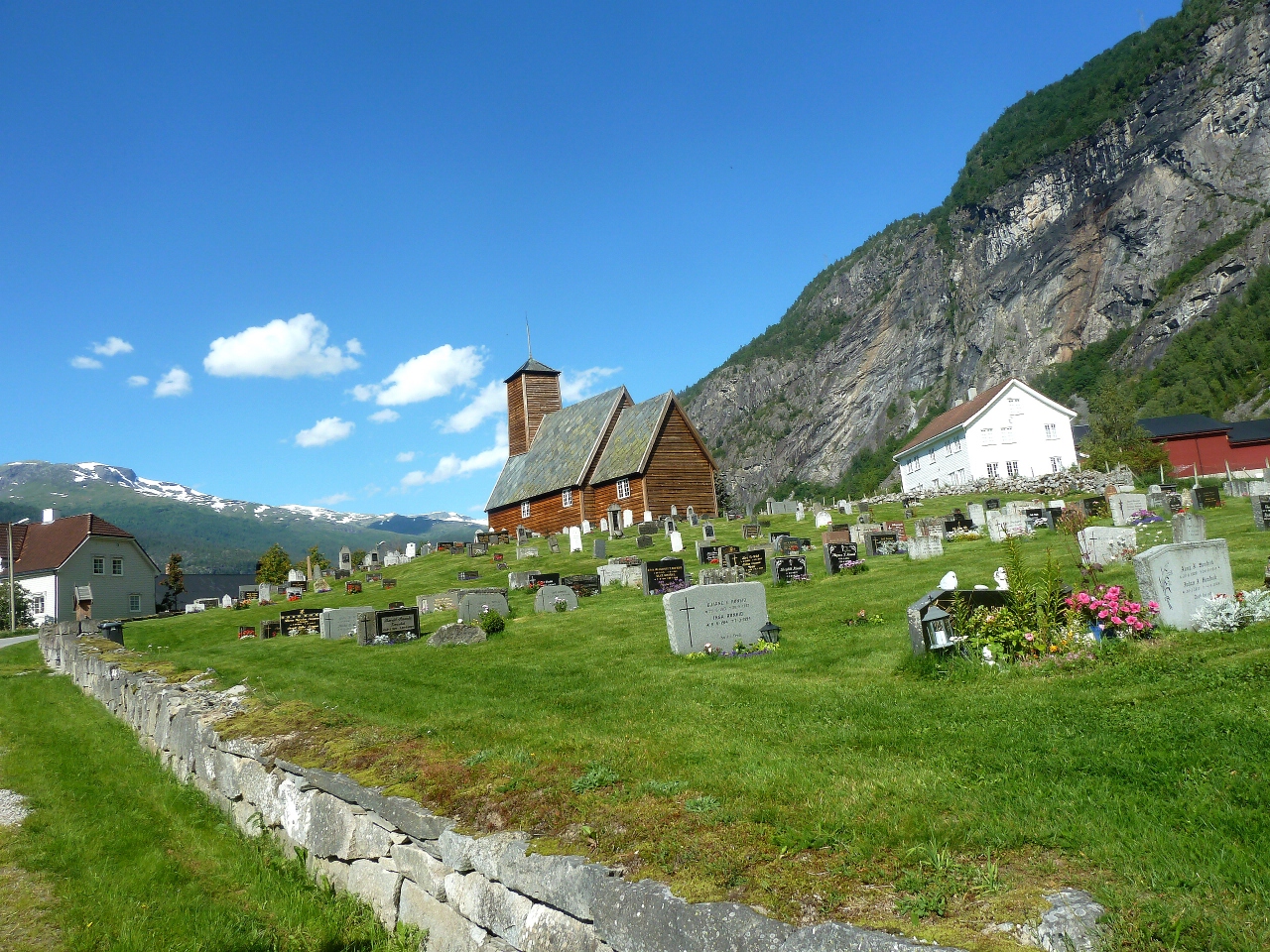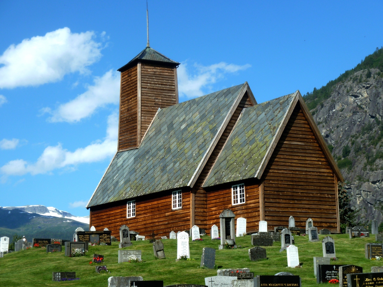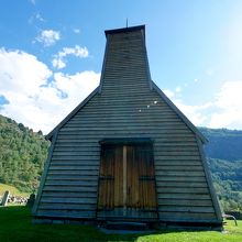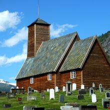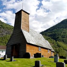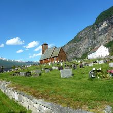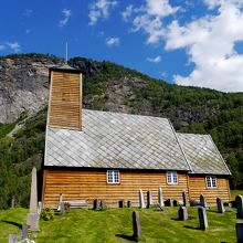 石の屋根の古教会.残念ながら見学できるのは7月のみで外観からの見学.1647年にStavkirkeに代わり作られた.1907年に今の教会にうつる.この教会も素朴なつくりだが,2段になった石の屋根が美しい.山の裾野にある小高い丘の上にあるたたずまいもいい.気に入った教会だった.