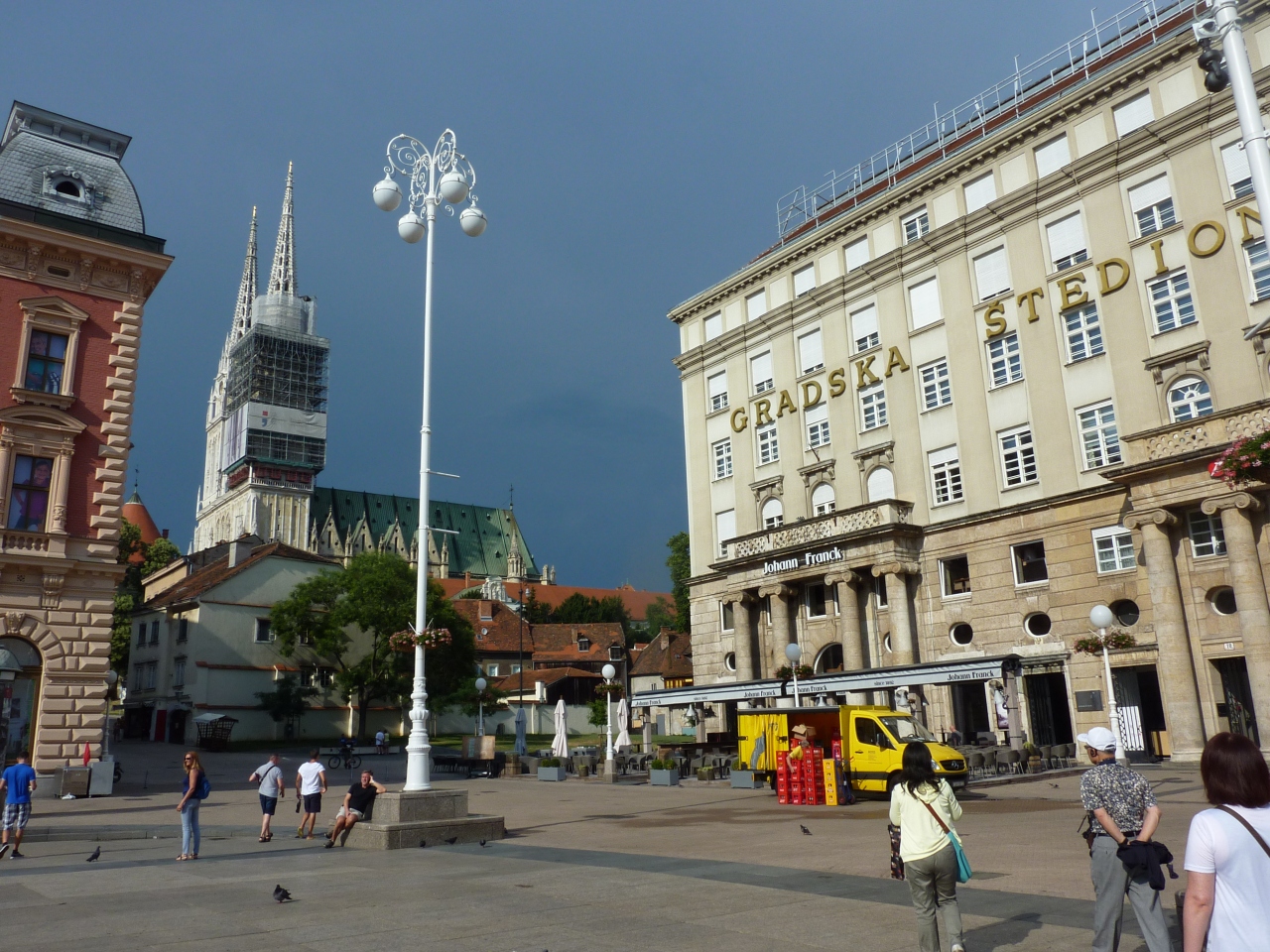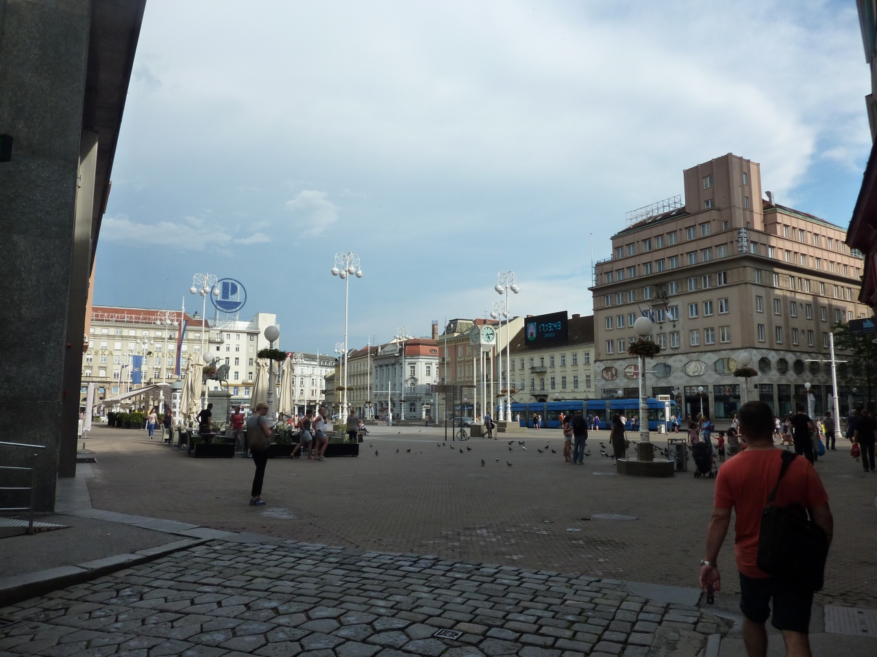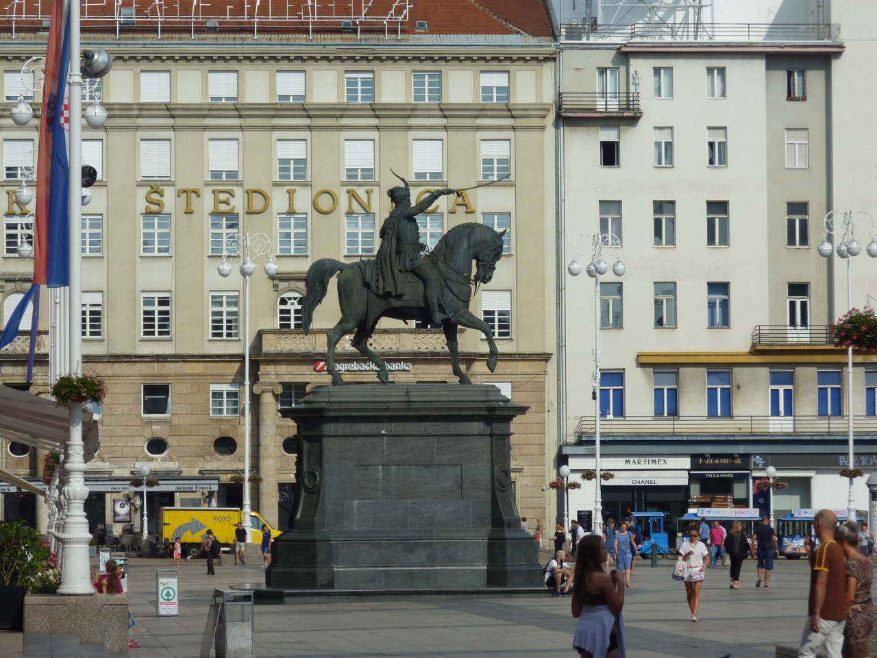 ザグレブ市内の中心地で旧市街カプトル地区に登る玄関口にもなっています。サッカー場ほどもある広場の周辺はカフェやレストラン、等の店が並び、ザグレブ中央駅からはトラムが走っています。広場の東の一角にはマンドゥシェヴァツに泉があり、中央北側にイェラチッチ総督の騎馬像が広場を見渡し、進軍の声をかけているようです