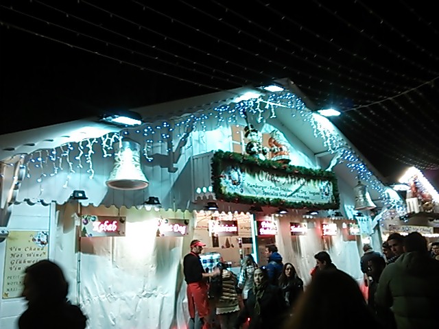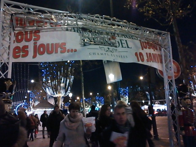 シャンゼリゼ通りのコンコルド広場側から約1kmに渡って、両側にクリスマスマーケットが出店しています。お店の種類はファストフード系(ホットドッグやサンドイッチ的な物)からお菓子(クレープ、ワッフル)、りんご飴的な物、更にはクリスマスの贈り物になりそうなグッズ(石鹸とかクリスマスの飾りとか)様々です。