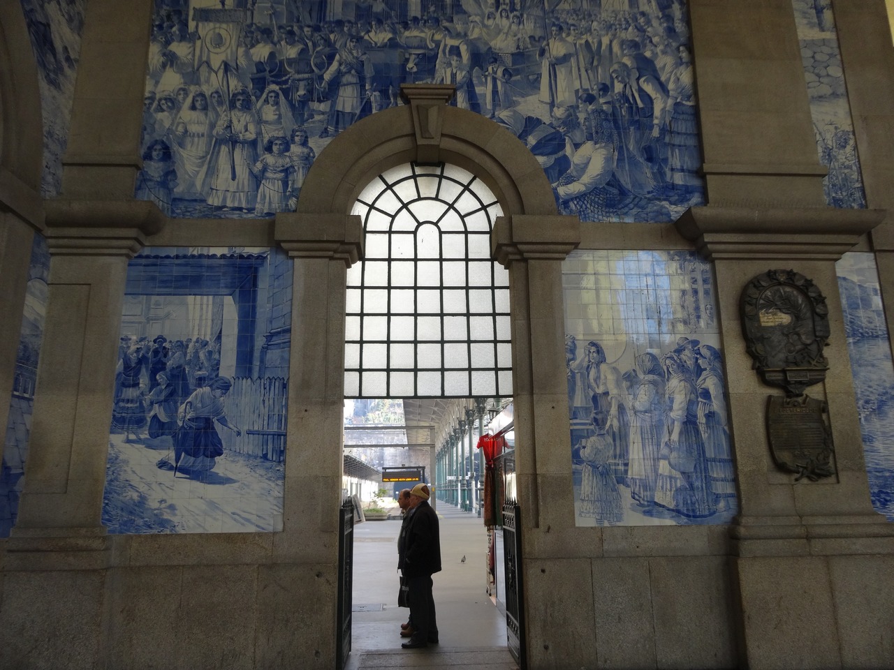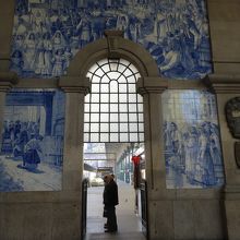 アズレージョが天井まで美しい駅。その天井は高く、開放的な美術館みたいです。構内とホームの間はただの通路で、ホームの電車も駅構内から見れます。ちなみに列車は黄色い車体で現代的。