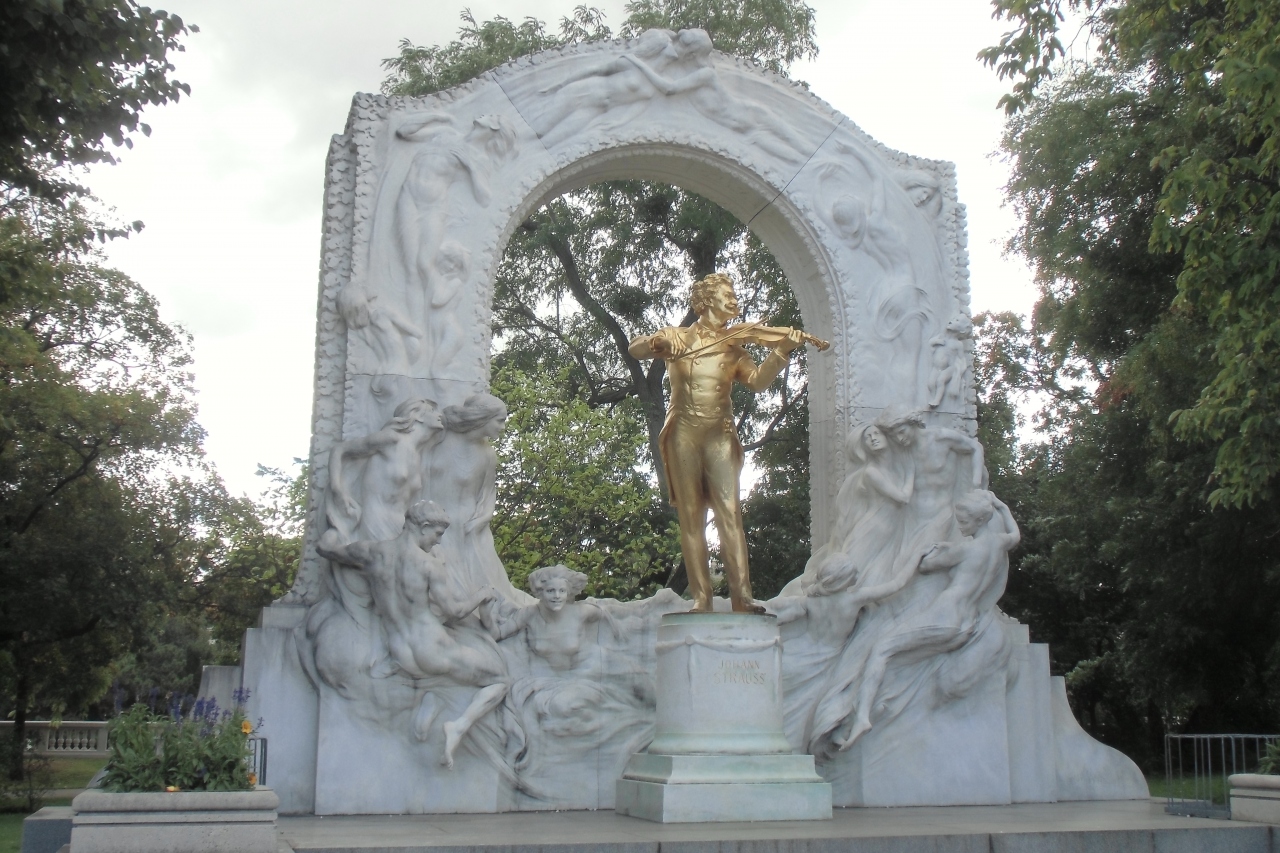 市立公園の一角にあるシュトラウス像。金色に塗られていてすぐに見つけられると思います。私が行ったときは天気も良かったので青空と、公園の緑と金色の像で写真をパチリ!近くには劇場もあってコンサートもされていますが、少し中心からはなれているので特別シュトラウス好きでなければついで程度でもいいかもしれません。