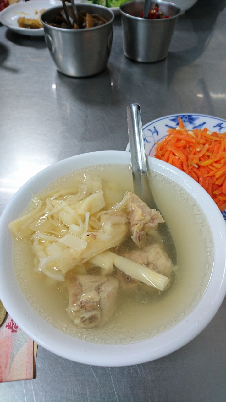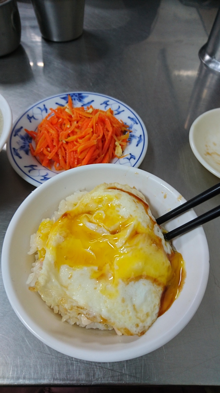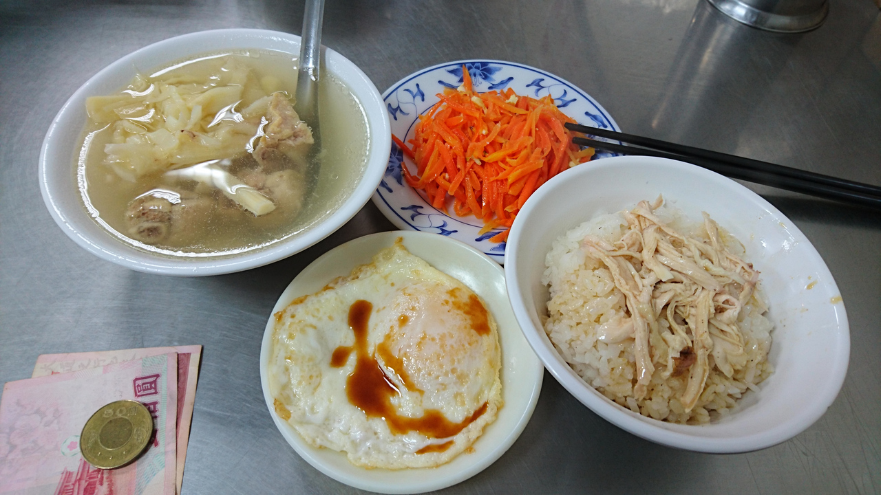 鶏肉飯、目玉焼き、ニンジンの炒め物、筍スープで130元でした。