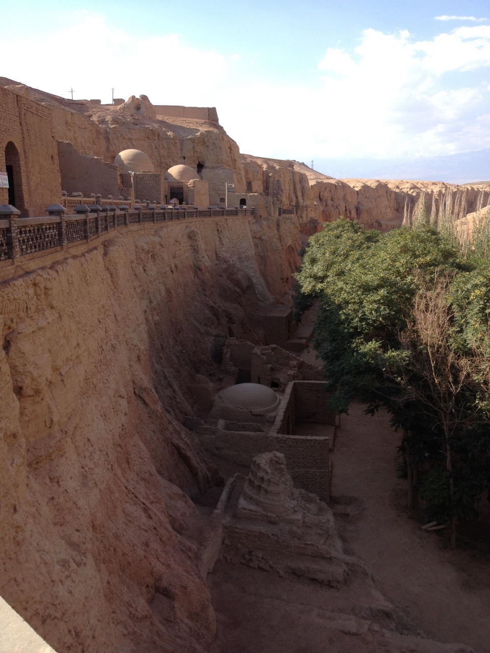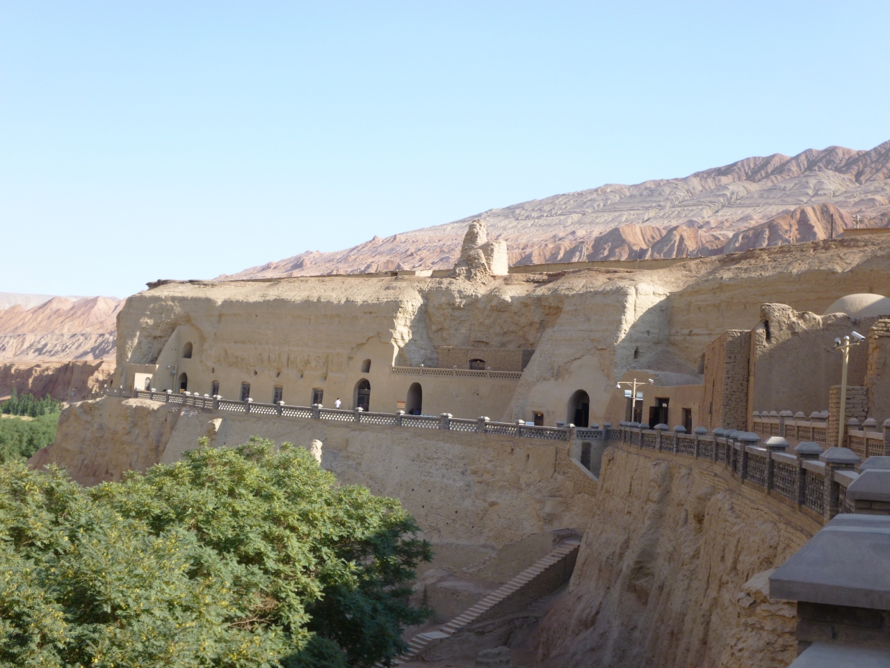 西遊記の映画が撮られた荒涼とした渓谷沿いの赤土の道を進んだところにありました。アプローチもなかなかの雰囲気でした。渓谷に石窟がいくつもあり、壁画を見ることができました。渓谷に造られた石窟群は必見です。