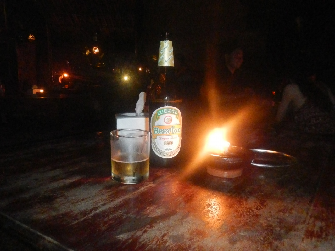 ガイドブックには「ナムカーン川に面したテラス席で寝そべりながら食事を楽しめる」とあったので行ってみると、確かに、三角枕があり、寝そべってのんびりできた。しかし、行った時間が夜だったので、店内がとにかく暗い。ビアラオ1本2万7千KIPと高い。昼間に行けば、また印象が違ったかもしれないが、私には合わなかった。