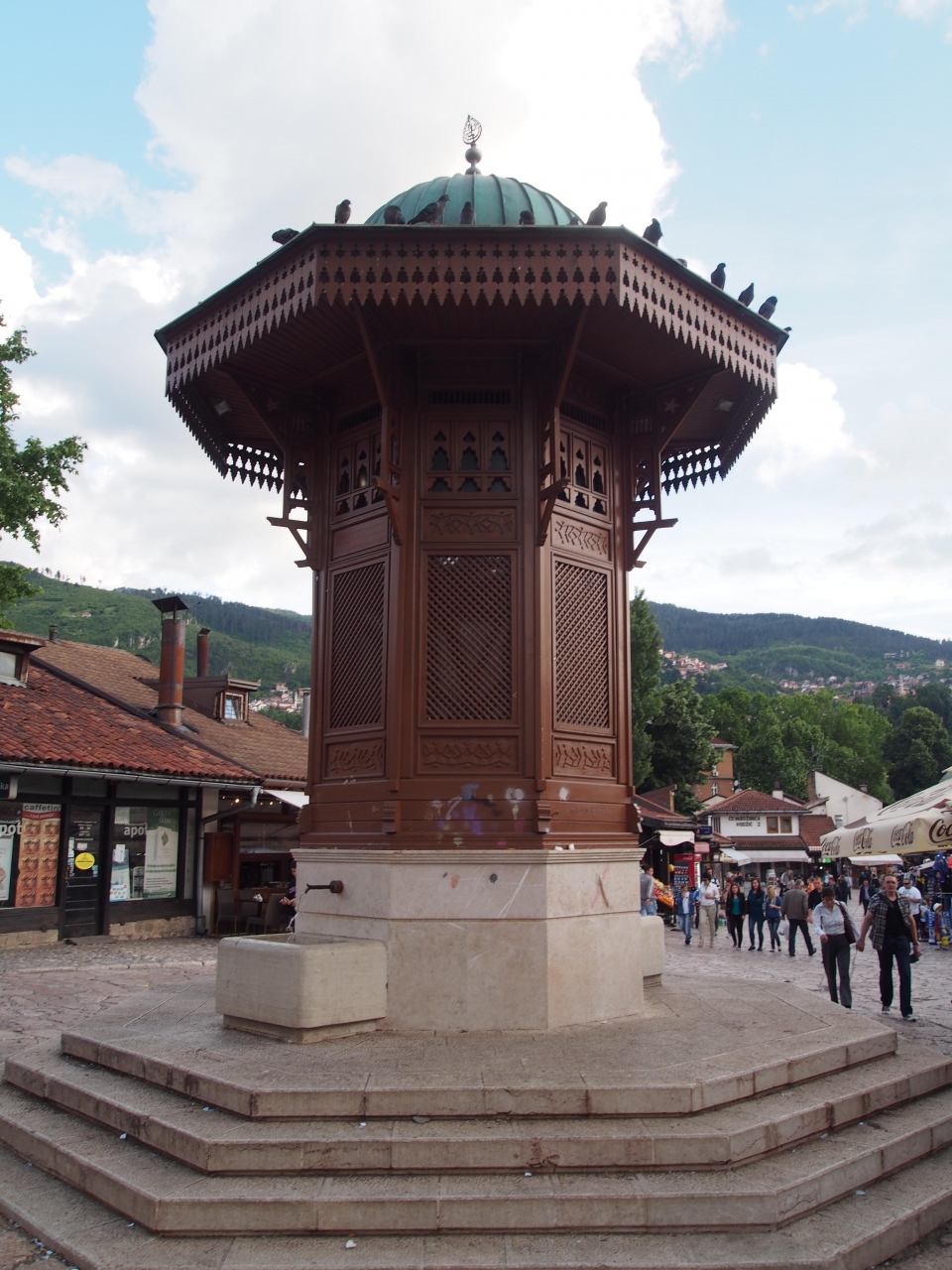 バシチャルシアの中心の広場に建っている水飲み場です。サラエボのモニュメント的存在で、記念写真を撮る観光客や、セビリの階段でくつろぐ地元民で混雑しています。サラエボの水は飲んでも問題ないと聞いていたので、他の人同様、飲んでみましたが大丈夫でした。セビリ周辺はスリが多いそうなので、写真撮影時など気をつけて下さい。