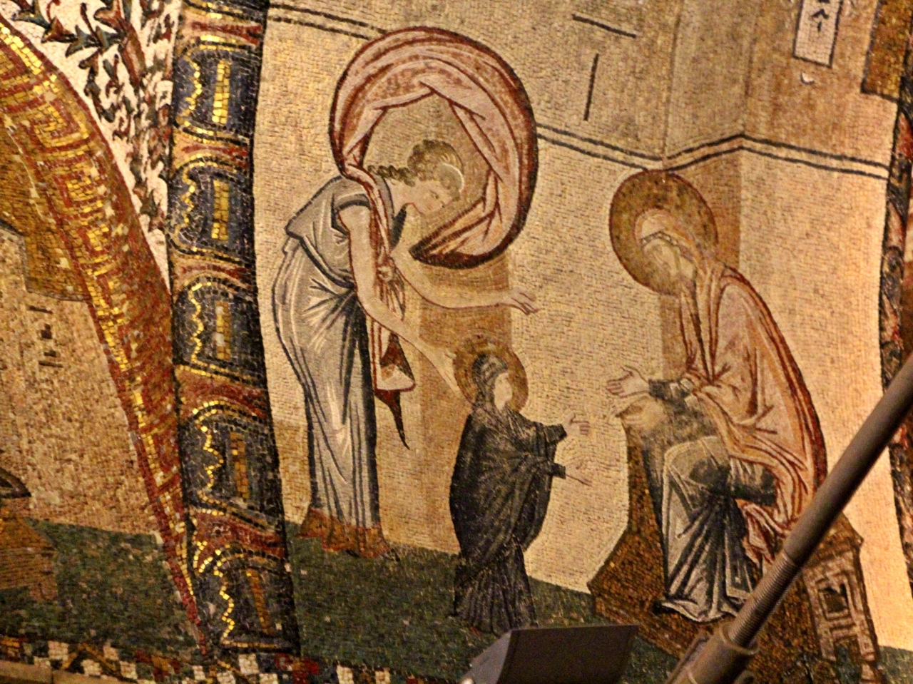 一般的な新約聖書では、マリアが物語に登場するのは大天使ガブリエルによる【受胎告知】からなのだが、コーラ修道院のモザイク画にはマリアの両親の様子、マリアの母が妊娠した時の状況、マリアの成長の過程などが描かれ、なかなか興味深い。