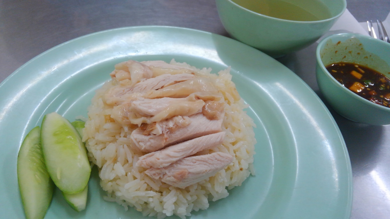 セントラルワールドからラーチャダムリ通りを北に向かいました。道の左側を歩いて行ったわけですが、プラトゥーナームの交差点で道路の右側に渡れず!つまり、お店のある東の方向に行けず!交差点をぐるっと360度回りました。はじめから右側を歩いて行ったほうがいいのかも。2時前でしたがしばらく行列に並び、相席でテーブルにつきました。ピンクのカオマンガイとしておなじみですが、当日は、BIKE FOR DADのイベント前ということもあってか、皆さん、BIKE FOR DADのポロシャツ姿で働いていらっしゃいました。