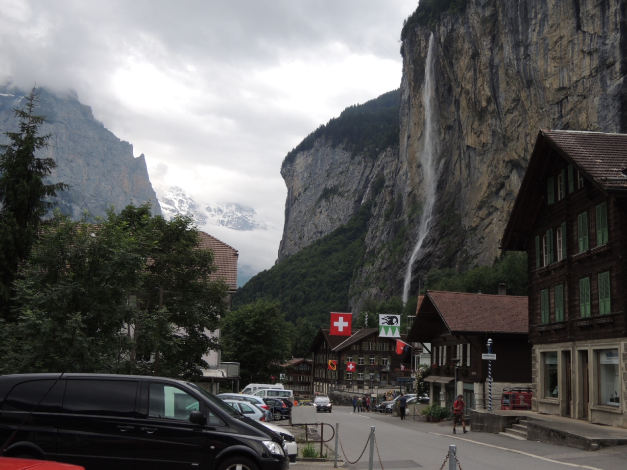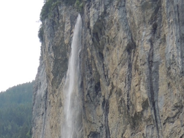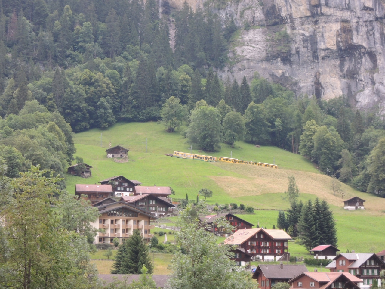 ラウターブルンネンの駅で電車の時間待ちが30分あったので、駅前の道を谷の奥の方へ10分ほど坂道を登って行くと、そこからは迫力のあるシュタウプバッハの滝が良く見えました。滝の反対側の牧草地の中をゆっくり登る電車も眺められ、良い写真が何枚も撮れましたました。