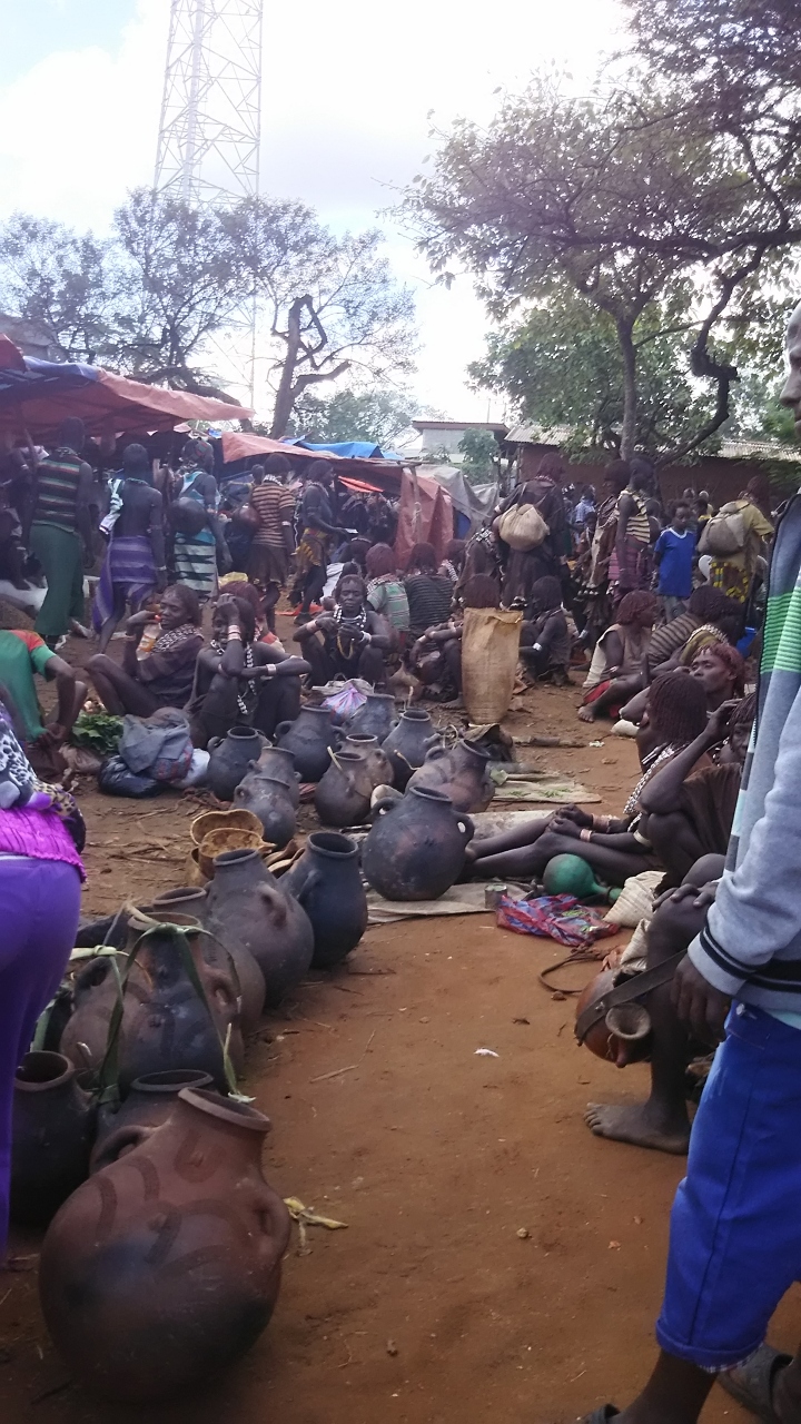 このマーケットにはハマル族などが沢山来ており、とてもエチオピアらしいところを味わうことができる所でした。いろいろな生活用品や土産物屋などもありますが、路上でハマル族の女性の特徴のひとつである髪形ドレッドヘアー(赤い泥で固める髪形)を作っている姿なども見ることができます。