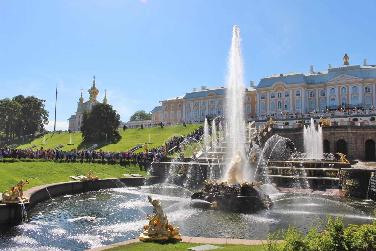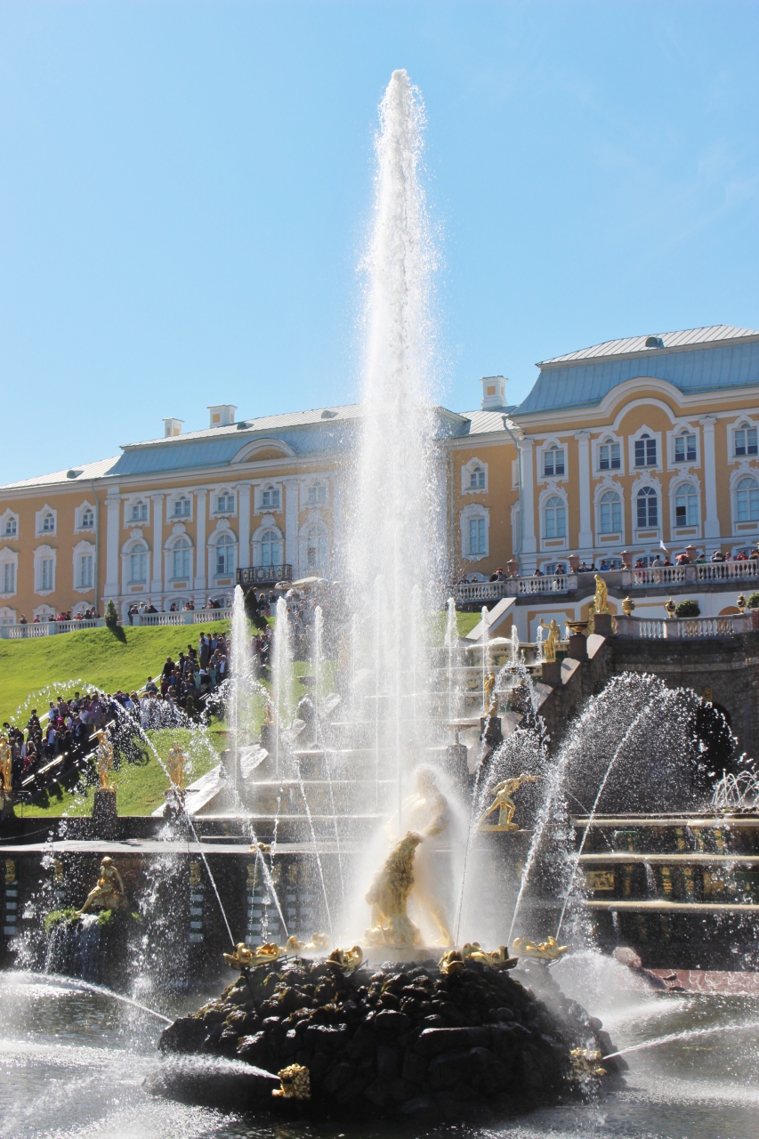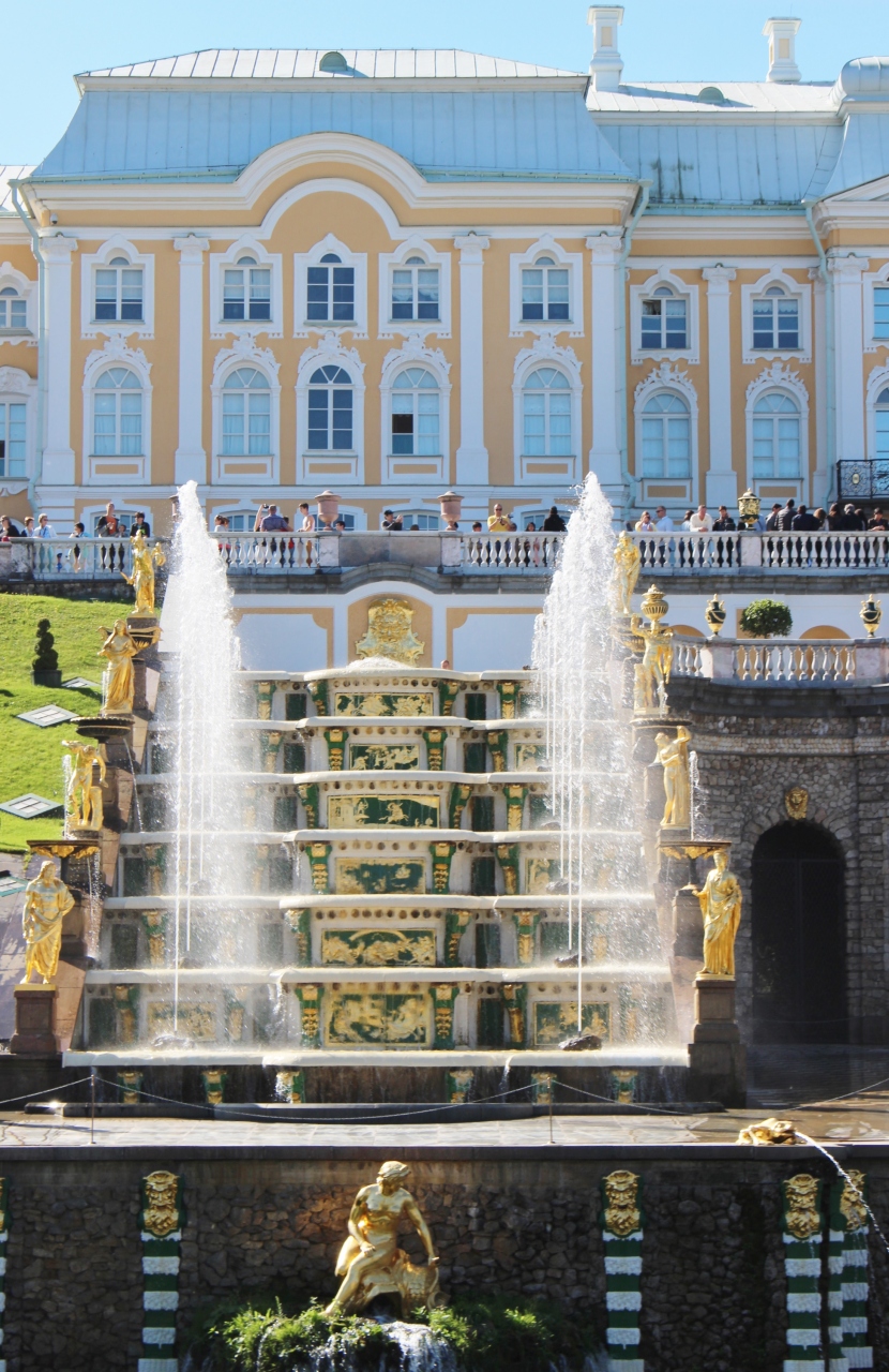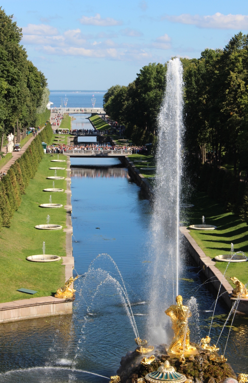 ペテルゴーフにあるピョートル大帝の夏の宮殿(下の公園)最大の見所は、7段の階段を利用した噴水(大滝)だと思います。中央のサムソン像など光り輝く多数の金箔の銅像が階段に配置され、噴水も大小様々。噴水の水は階段から運河へ流れていきます。とても壮大な眺めでした。