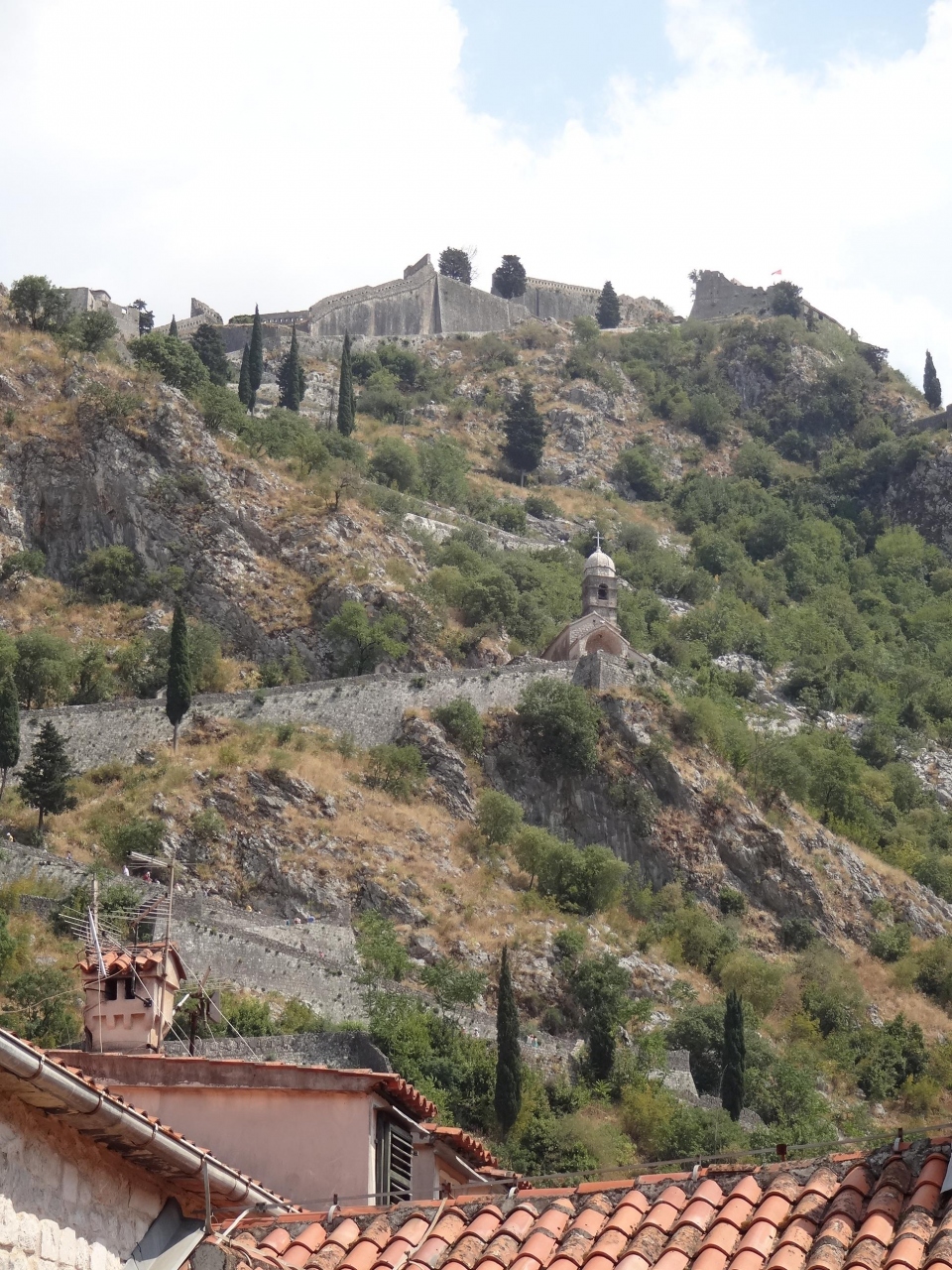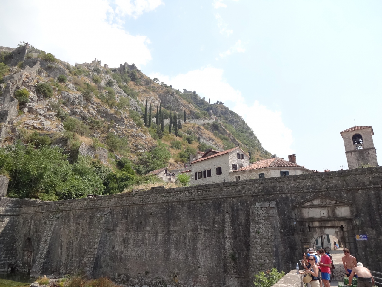 コトル旧市街の背後の山に築かれた城壁は見事です。城壁の入り口は旧市街の奥に2ヶ所あります。山の上のほうまで行くにはけっこうな上りになるので、暑い夏は登るのが大変だと思います。