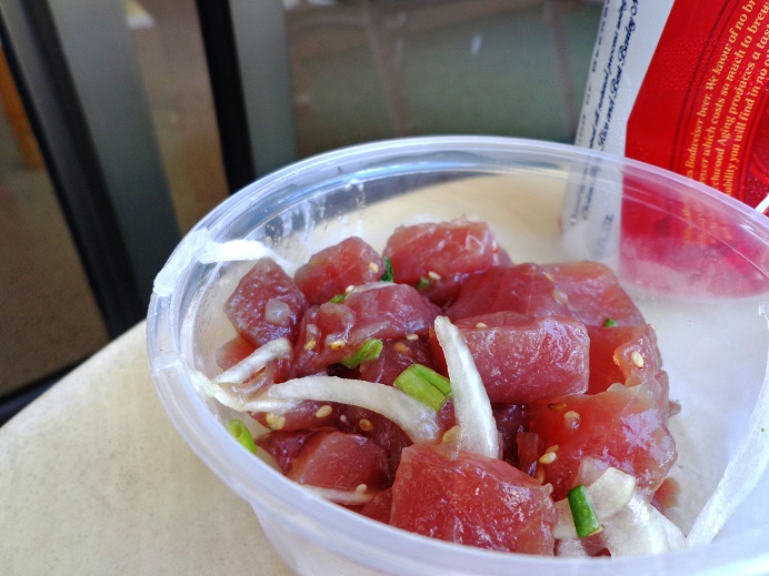 しょうゆとスパイシーの2種類を購入し、ホテルのラナイでビールとともにいただきましたが、どちらも流石に美味しいですね。マグロの身も良い所ばかり使っています。