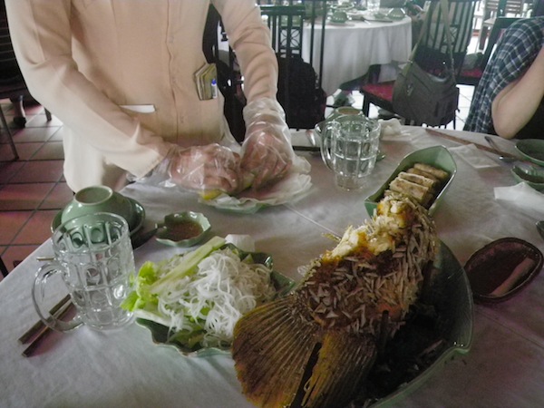 メコン河見学に来た観光客や、のツアーに参加するツアー客が多く利用するレストランです。店内はメコン河らしい雰囲気に満ちており、出てくる食事も生春巻きや風船餅など、観光客に受けそうなベトナム料理がたくさん出てきました。この地域の郷土料理であるエレファントイヤーフィッシュも登場、お店の人が手でフィッシュをちぎって取り分けてくれました。