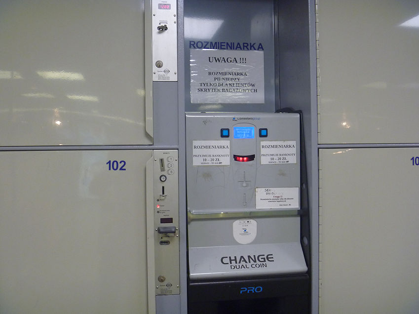 支払はコインのみ、ロッカーの並びにコインへの両替機がありましたが10zl札、20zl札からの両替のみでそれ以上高額紙幣からの両替は不可でした。
