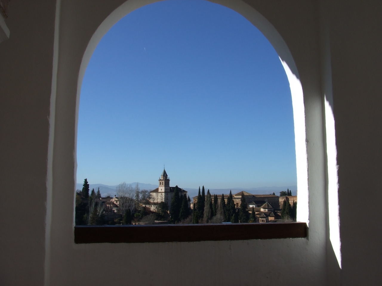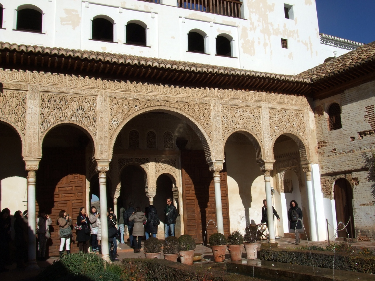 夏の離宮ヘネラリーフェの中にある庭園。細長い水路を建物と回廊が取り囲み、緑が丁寧に刈り込まれた美しい庭園。冬に行ったので少し寂しい感じでしたが、夏にはブーゲンビリアも咲くそうです。この庭の水はネバダ山脈から引き込まれ、イスラム独特の技法で様々な水の趣向が凝らされているらしい。回廊から見えるアルハンブラ宮殿も素敵でした。