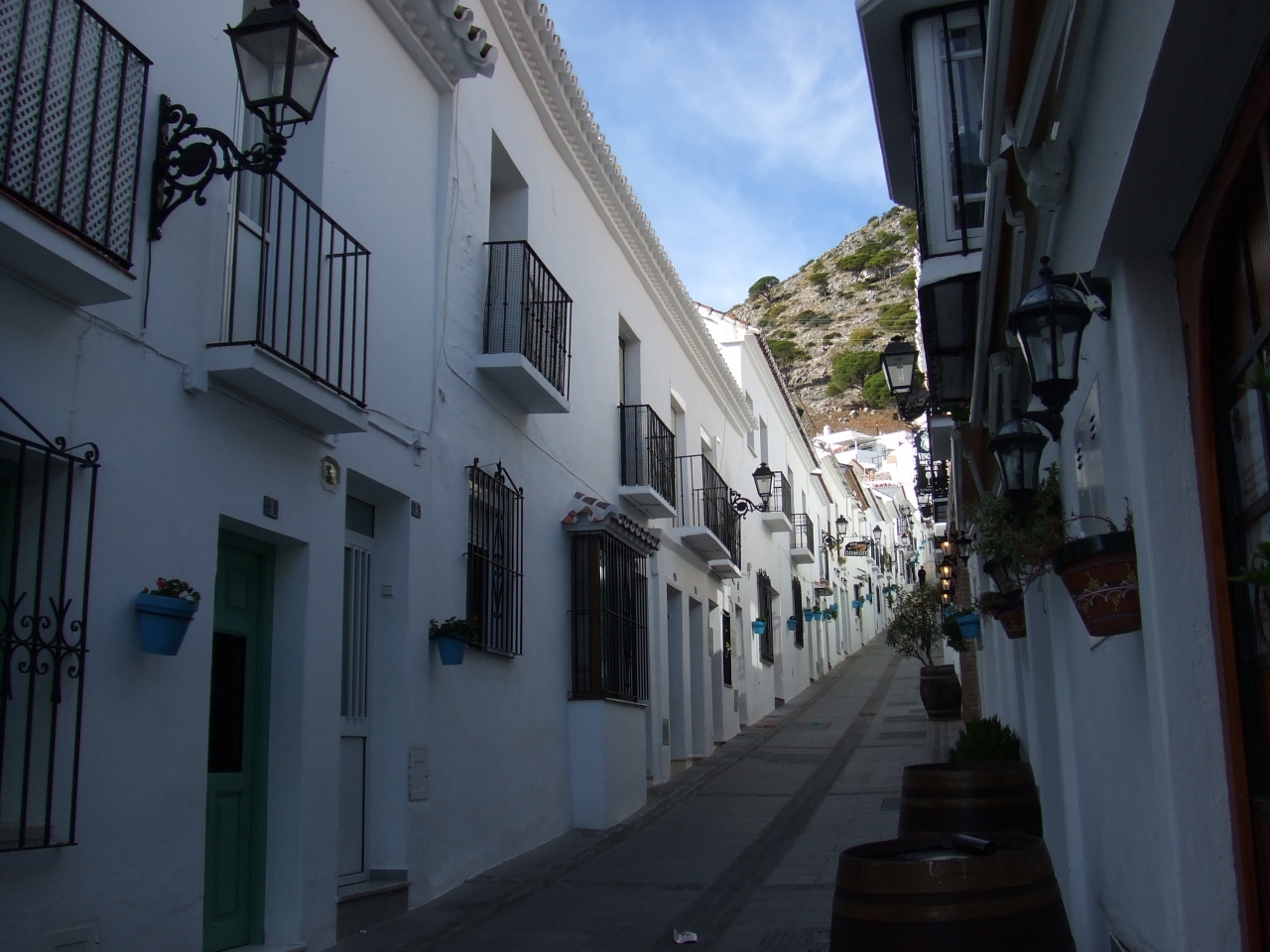 ガイドブックや雑誌でよく見かける通り。白い村ミハスの中でも特に絵になる通りです。なだらかな坂に白い家が連なり、青い植木鉢が並ぶように壁にかけられアクセントになり、美しい写真が撮れます。ただ人が入らないように撮るのは難しい。青い植木鉢はコルドバの花の小径にも沢山かかってました。